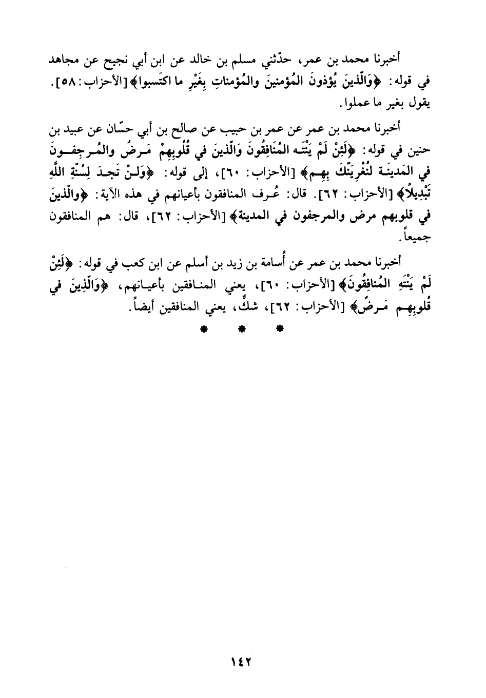 أَخْبَرَنَا مُحَمَّدُ بْنُ عُمَرَ عَنْ أُسَامَةَ بْنِ زَيْدٍ بْنِ أَسْلَمَ عَنِ ابْنِ كَعْبٍ فِي قَوْلِهِ: «لَئِنْ لَمْ يَنْتَهِ الْمُنافِقُونَ» الأحزاب: 60. يَعْنِي الْمُنَافِقِينَ بِأَعْيَانِهِمْ. «وَالَّذِينَ فِي قُلُوبِهِمْ مَرَضٌ» الأحزاب: 62. شَكٌّ. يَعْنِي الْمُنَافِقِينَ أَيْضًا.