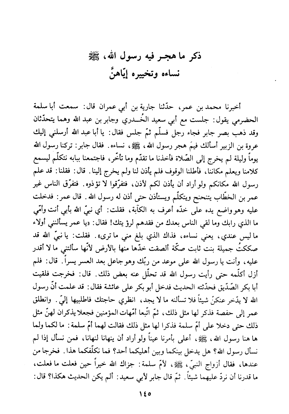 أَخْبَرَنَا مُحَمَّدُ بْنُ عُمَرَ. حَدَّثَنَا جَارِيَةُ بْنُ أَبِي عِمْرَانَ قَالَ: سَمِعْتُ أَبَا سَلَمَةَ الْحَضْرَمِيَّ يَقُولُ: جَلَسْتُ مَعَ أَبِي سَعِيدٍ الْخُدْرِيِّ وَجَابِرِ بْنِ عَبْدِ اللَّهِ وَهُمَا يَتَحَدَّثَانِ وَقَدْ ذَهَبَ بَصَرُ جَابِرٍ فَجَاءَ رَجُلٌ فَسَلَّمَ ثُمَّ جَلَسَ فَقَالَ: يَا أَبَا عَبْدِ اللَّهِ أَرْسَلَنِي إِلَيْكَ عُرْوَةُ بْنُ الزُّبَيْرِ أَسْأَلُكَ فِيمَ هَجَرَ رَسُولُ اللَّهِ - صَلَّى اللَّهُ عَلَيْهِ وَسَلَّمَ - نِسَاءَهُ. فَقَالَ جَابِرٌ: تَرَكْنَا رَسُولَ اللَّهِ يَوْمًا وَلَيْلَةً لَمْ يَخْرُجْ إِلَى الصَّلاةِ فَأَخَذْنَا مَا تَقَدَّمَ وَمَا تَأَخَّرَ. فَاجْتَمَعْنَا بِبَابِهِ نَتَكَلَّمُ لَيَسْمَعَ كَلامَنَا وَيَعْلَمَ مَكَانَنَا. فَأَطَلْنَا الْوُقُوفَ فَلَمْ يَأْذَنْ لَنَا وَلَمْ يَخْرُجْ إِلَيْنَا. قَالَ: فَقُلْنَا: قَدْ عَلِمَ رَسُولُ اللَّهِ مَكَانَكُمْ وَلَوْ أَرَادَ أَنْ يَأْذَنَ لَكُمْ لأَذِنَ. فَتَفَرَّقُوا لا تُؤْذُوهُ. فَتَفَرَّقَ النَّاسُ غَيْرَ عُمَرَ بْنِ الْخَطَّابِ يَتَنَحْنَحُ وَيَتَكَلَّمُ وَيَسْتَأْذِنُ حَتَّى أَذِنَ لَهُ رَسُولُ اللَّهِ. قَالَ عُمَرُ: فَدَخَلْتُ عَلَيْهِ وَهُوَ وَاضِعٌ يَدَهُ عَلَى خَدِّهِ أَعْرِفُ بِهِ الْكَآبَةَ. فَقُلْتُ: أَيْ نَبِيَّ اللَّهِ بِأَبِي أَنْتَ وَأُمِّي مَا الَّذِي رَابَكَ وَمَا لَقِيَ النَّاسُ بَعْدَكَ مِنْ فَقْدِهِمْ لِرُؤْيَتِكَ! [فَقَالَ: يَا عُمَرُ يَسْأَلْنَنِي أُولاءِ مَا لَيْسَ عِنْدِي. يَعْنِي نِسَاءَهُ. فَذَاكَ الَّذِي بَلَغَ مِنِّي مَا تَرَى] . فَقُلْتُ: يَا نَبِيَّ اللَّهِ قَدْ صَكَكْتُ جَمِيلَةَ بِنْتَ ثَابِتٍ صَكَّةً أَلْصَقْتُ خَدَّهَا مِنْهَا بِالأَرْضِ لأَنَّهَا سَأَلَتْنِي مَا لا أَقْدِرُ عَلَيْهِ. وَأَنْتَ يَا رَسُولَ اللَّهِ عَلَى مَوْعِدٍ مِنْ رَبِّكَ وَهُوَ جَاعِلٌ بَعْدَ الْعُسْرِ يَسْرًا. قَالَ: فَلَمْ أَزَلْ أُكَلِّمُهُ حَتَّى رَأَيْتُ رَسُولَ اللَّهِ قَدْ تَحَلَّلَ عَنْهُ بَعْضُ ذَلِكَ. قَالَ: فَخَرَجْتُ فَلَقِيتُ أَبَا بَكْرٍ الصِّدِّيقَ فَحَدَّثْتُهُ الْحَدِيثَ فَدَخَلَ أَبُو بَكْرٍ عَلَى عَائِشَةَ فَقَالَ: قَدْ عَلِمْتُ أَنَّ رَسُولَ اللَّهِ لا يَدَّخِرُ عَنْكُنَّ شَيْئًا فَلا تَسْأَلْنَهُ مَا لا يَجِدُ. انْظُرِي حَاجَتَكِ فَاطْلُبِيهَا إِلَيَّ. وَانْطَلَقَ عُمَرُ إِلَى حَفْصَةَ فَذَكَرَ لَهَا مِثْلَ ذَلِكَ. ثُمَّ اتَّبَعَا أُمَّهَاتِ الْمُؤْمِنِينَ فَجَعَلا يَذْكُرَانِ لَهُنَّ مِثْلَ ذَلِكَ حَتَّى دَخَلا عَلَى أُمِّ سَلَمَةَ فَذَكَرَا لَهَا مِثْلَ ذَلِكَ فَقَالَتْ لَهُمَا أم سلمة: ما لكما ولما هاهنا رَسُولُ اللَّهِ - صَلَّى اللَّهُ عَلَيْهِ وَسَلَّمَ - أَعْلَى بِأَمْرِنَا عَيْنَا وَلَوْ أَرَادَ أَنْ يَنْهَانَا لَنَهَانَا. فَمَنْ نَسْأَلُ إِذَا لَمْ نَسْأَلْ رَسُولَ اللَّهِ؟ هَلْ يَدْخُلُ بَيْنَكُمَا وَبَيْنَ أَهْلِيكُمَا أَحَدٌ؟ فَمَا نُكَلِّفُكُمَا هَذَا. فَخَرَجَا مِنْ عِنْدِهَا. فَقَالَ أَزْوَاجُ النَّبِيِّ - صَلَّى اللَّهُ عَلَيْهِ وَسَلَّمَ - لأُمِّ سَلَمَةَ: جَزَاكِ اللَّهُ خَيْرًا حِينَ فَعَلْتِ مَا فَعَلْتِ.