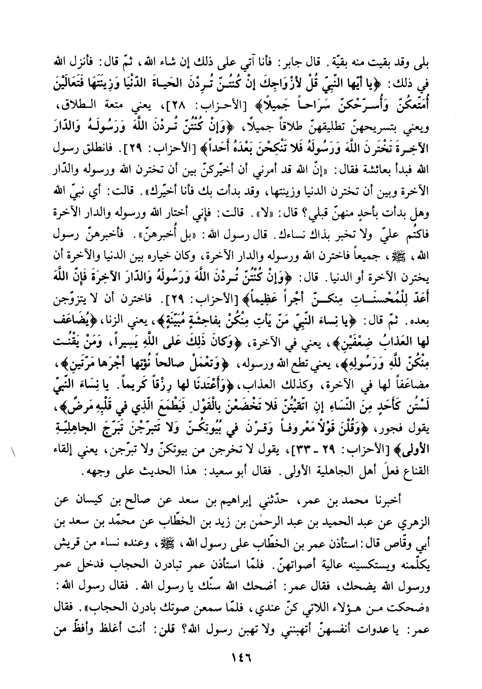 بَلَى وَقَدْ بَقِيَتْ مِنْهُ بَقِيَّةٌ. قَالَ جَابِرٌ: فَأَنَا آتِي عَلَى ذَلِكَ إِنْ شَاءَ اللَّهُ. ثم قال: فأنزل الله في ذلك: «يا أَيُّهَا النَّبِيُّ قُلْ لِأَزْواجِكَ إِنْ كُنْتُنَّ تُرِدْنَ الْحَياةَ الدُّنْيا وَزِينَتَها فَتَعالَيْنَ أُمَتِّعْكُنَّ وَأُسَرِّحْكُنَّ سَراحاً جَمِيلًا» الأحزاب: 28. يَعْنِي مُتْعَةَ الطَّلاقِ.