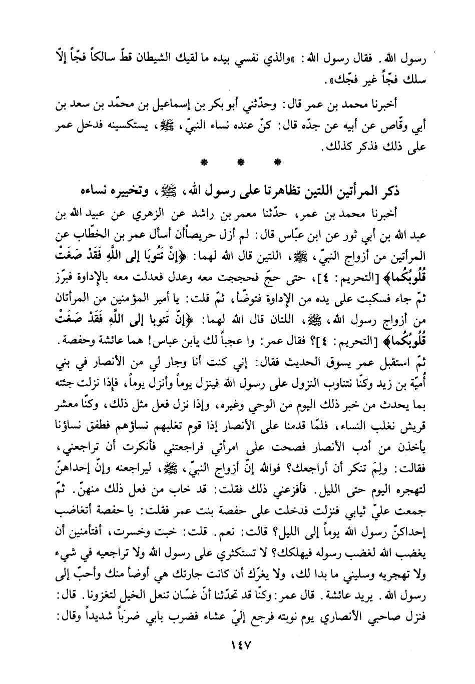 أَخْبَرَنَا مُحَمَّدُ بْنُ عُمَرَ. حَدَّثَنَا مَعْمَرُ بْنُ رَاشِدٍ عَنِ الزُّهْرِيِّ عَنْ عُبَيْدِ اللَّهِ بْنِ عَبْدِ اللَّهِ بْنِ أَبِي ثَوْرٍ عَنِ ابْنِ عَبَّاسٍ قَالَ: لَمْ أَزَلْ حَرِيصًا أَنْ أَسْأَلَ عُمَرَ بْنَ الْخَطَّابِ عَنِ الْمَرْأَتَيْنِ مِنْ أَزْوَاجِ النَّبِيِّ - صَلَّى اللَّهُ عَلَيْهِ وَسَلَّمَ - اللَّتَيْنِ قَالَ اللَّهُ لَهُمَا: «إِنْ تَتُوبا إِلَى اللَّهِ فَقَدْ صَغَتْ قُلُوبُكُما» التحريم: 4. حَتَّى حَجَّ فَحَجَجْتُ مَعَهُ وَعَدَلَ فعدلت معه بالإداوة فبرز ثُمَّ جَاءَ فَسَكَبْتُ عَلَى يَدِهِ مِنَ الإِدَاوَةِ فَتَوَضَّأَ. ثُمَّ قُلْتُ: يَا أَمِيرَ الْمُؤْمِنِينَ مَنِ الْمَرْأَتَانِ مِنْ أَزْوَاجِ رَسُولِ اللَّهِ - صَلَّى اللَّهُ عَلَيْهِ وَسَلَّمَ - اللَّتَانِ قَالَ اللَّهُ لَهُمَا: «إِنْ تَتُوبا إِلَى اللَّهِ فَقَدْ صَغَتْ قُلُوبُكُما» التحريم: 4؟ فقال عمر: وا عجبا لك يا بن عَبَّاسٍ! هُمَا عَائِشَةُ وَحَفْصَةُ.