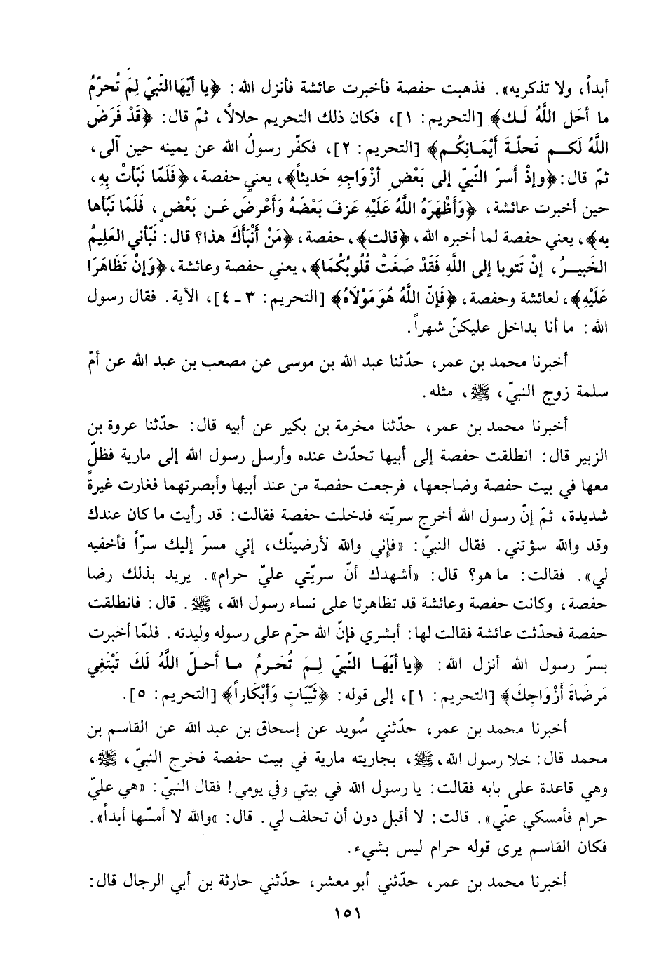 أَخْبَرَنَا مُحَمَّدُ بْنُ عُمَرَ. حَدَّثَنَا مَخْرَمَةُ بْنُ بُكَيْرٍ عَنْ أَبِيهِ قَالَ: حَدَّثَنَا عُرْوَةُ بْنُ الزُّبَيْرِ قَالَ: انْطَلَقَتْ حَفْصَةُ إِلَى أَبِيهَا تُحَدِّثُ عِنْدَهُ وَأَرْسَلَ رَسُولُ اللَّهِ إِلَى مَارِيَةَ فَظَلَّ مَعَهَا فِي بَيْتِ حَفْصَةَ وَضَاجَعَهَا. فَرَجَعَتْ حَفْصَةُ مِنْ عِنْدِ أَبِيهَا وَأَبْصَرَتْهُمَا فَغَارَتْ غَيْرَةً شَدِيدَةً. ثُمَّ إِنَّ رَسُولَ اللَّهِ أَخْرَجَ سُرِّيَّتَهُ فَدَخَلَتْ حَفْصَةُ فَقَالَتْ: قَدْ رَأَيْتُ مَا كَانَ عِنْدَكَ وَقَدْ وَاللَّهِ سُؤْتَنِي. فَقَالَ النَّبِيُّ: فَإِنِّي وَاللَّهِ لأُرْضِيَنَّكِ. إِنِّي مُسِرٌّ إِلَيْكِ سِرًّا فَأَخْفِيهِ لِي. فَقَالَتْ: مَا هُوَ؟ قَالَ: أُشْهِدُكِ أَنَّ سُرِّيَّتِي عَلَيَّ حَرَامٌ. يُرِيدُ بِذَلِكَ رِضَا حَفْصَةَ. وَكَانَتْ حَفْصَةُ وَعَائِشَةُ قَدْ تَظَاهَرَتَا عَلَى نِسَاءِ رَسُولِ اللَّهِ - صَلَّى اللَّهُ عَلَيْهِ وَسَلَّمَ - قَالَ: فَانْطَلَقَتْ حَفْصَةُ فَحَدَّثَتْ عَائِشَةَ فَقَالَتْ لَهَا: أَبْشِرِي فَإِنَّ اللَّهَ حَرَّمَ عَلَى رَسُولِهِ وَلِيدَتَهُ. فَلَمَّا أَخْبَرَتْ بِسِرِّ رَسُولِ اللَّهِ أنزل الله: «يا أَيُّهَا النَّبِيُّ لِمَ تُحَرِّمُ مَا أَحَلَّ اللَّهُ لَكَ تَبْتَغِي مَرْضاتَ أَزْواجِكَ» التحريم: 1. إِلَى قَوْلِهِ: «ثَيِّباتٍ وَأَبْكاراً» التحريم: 5.