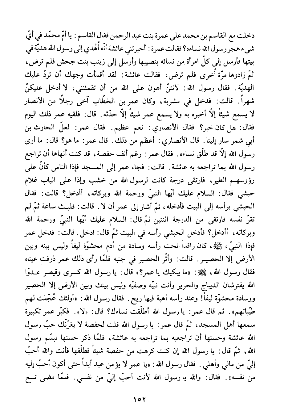 ثُمَّ زَادُوهَا مَرَّةً أُخْرَى فَلَمْ تَرَضْ. فَقَالَتْ عَائِشَةُ: لَقَدْ أَقْمَأَتْ وَجْهَكَ أَنْ تَرُدَّ عَلَيْكَ الْهَدِيَّةَ. [فَقَالَ رَسُولُ اللَّهِ: لأَنْتُنَّ أَهْوَنُ عَلَى اللَّهِ مِنْ أَنْ تُقْمِئْنَنِي. لا أَدْخُلُ عَلَيْكُنَّ شَهْرًا.] قَالَتْ: فَدَخَلَ فِي مَشْرُبَةٍ. وَكَانَ عُمَرُ بْنُ الْخَطَّابِ آخَى رَجُلا مِنَ الأَنْصَارِ لا يَسْمَعُ شَيْئًا إِلا أَخْبَرَهُ بِهِ وَلا يَسْمَعُ عُمَرُ شَيْئًا إِلا حَدَّثَهُ. قَالَ: فَلَقِيَهُ عُمَرُ ذَلِكَ الْيَوْمَ فَقَالَ: هَلْ كَانَ خَبَرٌ؟ فَقَالَ الأَنْصَارِيُّ: نَعَمْ عَظِيمٌ. فَقَالَ عُمَرُ: لَعَلَّ الْحَارِثَ بْنَ أَبِي شِمْرٍ سَارَ إِلَيْنَا. قَالَ الأَنْصَارِيُّ: أَعْظَمُ مِنْ ذَلِكَ. قَالَ عُمَرُ: مَا هُوَ؟ قَالَ: مَا أَرَى رَسُولَ اللَّهِ إِلا قَدْ طَلَّقَ نِسَاءَهُ. فَقَالَ عُمَرُ: رَغِمَ أَنْفُ حَفْصَةَ. قَدْ كُنْتُ أَنْهَاهَا أَنْ تُرَاجِعَ رَسُولَ اللَّهِ بِمَا تُرَاجِعُهُ بِهِ عَائِشَةُ. قَالَتْ: فَجَاءَ عُمَرُ إِلَى المسجد فإذا الناس كأن على رؤوسهم الطَّيْرَ. فَارْتَقَى دَرَجَةً كَانَتْ لِرَسُولِ اللَّهِ مِنْ خَشَبٍ وَإِذَا عَلَى الْبَابِ غُلامٌ حَبَشِيُّ فَقَالَ: السَّلامُ عَلَيْكَ أَيُّهَا النَّبِيُّ وَرَحْمَةُ اللَّهِ وَبَرَكَاتُهُ. أأدخل؟ قَالَتْ: فَقَالَ الْحَبَشِيُّ بِرَأْسِهِ إِلَى الْبَيْتِ فَأَدْخَلَهُ. ثم أشار إلى عمر أن لا. قالت: فَلَبِثَ سَاعَةً ثُمَّ لَمْ تَقَرَّ نَفْسُهُ فَارْتَقَى مِنَ الدَّرَجَةِ اثْنَتَيْنِ ثُمَّ قَالَ: السَّلامُ عَلَيْكَ أَيُّهَا النَّبِيُّ وَرَحْمَةُ اللَّهِ وَبَرَكَاتُهُ. أأدخل؟ فَأَدْخَلَ الْحَبَشِيُّ رَأْسَهُ فِي الْبَيْتِ ثُمَّ قَالَ: ادْخُلْ. قَالَتْ: فَدَخَلَ عُمَرُ فَإِذَا النَّبِيُّ - صَلَّى اللَّهُ عَلَيْهِ وَسَلَّمَ - كَانَ رَاقِدًا تَحْتَ رَأْسِهِ وِسَادَةٌ مِنْ أَدَمٍ مَحْشُوَّةٌ لِيفًا وَلَيْسَ بَيْنَهُ وَبَيْنَ الأَرْضِ إِلا الْحَصِيرُ. قَالَتْ: وَأَثَّرَ الْحَصِيرُ فِي جَنْبِهِ فَلَمَّا رَأَى ذَلِكَ عُمَرُ ذَرِفَتْ عيناه فقال رسول الله. ص: مَا يُبْكِيكَ يَا عُمَرُ؟ قَالَ: يَا رَسُولَ اللَّهِ كِسْرَى وَقَيْصَرُ عَدُوَّا اللَّهِ يَفْتَرِشَانِ الدِّيبَاجَ وَالْحَرِيرَ وَأَنْتَ نَبِيُّهُ وَصَفِيُّهُ وَلَيْسَ بَيْنَكَ وَبَيْنَ الأَرْضِ إِلا الْحَصِيرُ وَوِسَادَةٌ مَحْشُوَّةٌ لِيفًا! وَعِنْدَ رَأْسِهِ أُهْبَةٌ فِيهَا رِيحٌ. [فَقَالَ رَسُولُ اللَّهِ: أُولَئِكَ عُجِّلَتْ لَهُمْ طَيِّبَاتُهُمْ] . ثُمَّ قَالَ عُمَرُ: يَا رَسُولَ اللَّهِ أَطَلَّقْتَ نِسَاءَكَ؟ قَالَ: لا. فَكَبَّرَ عُمَرُ تَكْبِيرَةً سَمِعَهَا أَهْلُ الْمَسْجِدِ. ثُمَّ قَالَ عُمَرُ: يَا رَسُولَ اللَّهِ قُلْتُ لِحَفْصَةَ لا يَغُرَّنَّكِ حُبُّ رَسُولِ اللَّهِ عَائِشَةَ وَحُسْنُهَا أَنْ تُرَاجِعِيهِ بِمَا تُرَاجِعُهُ بِهِ عَائِشَةُ. فَلَمَّا ذَكَرَ حُسْنَهَا تَبَسَّمَ رَسُولُ اللَّهِ. ثُمَّ قَالَ: يَا رَسُولَ اللَّهِ إِنْ كُنْتَ كَرِهْتَ مِنْ حَفْصَةَ شَيْئًا فَطَلِّقْهَا فَأَنْتَ وَاللَّهِ أَحَبُّ إِلَيَّ مِنْ مَالِي وَأَهْلِي. [فَقَالَ رَسُولُ اللَّهِ: يَا عُمَرُ لا يُؤْمِنُ عَبْدٌ أَبَدًا حَتَّى أَكُونَ أَحَبَّ إِلَيْهِ مِنْ نَفْسِهِ] . فَقَالَ: وَاللَّهِ يَا رَسُولَ اللَّهِ لأَنْتَ أَحَبُّ إِلَيَّ مِنْ نَفْسِي. فَلَمَّا مَضَى تِسْعٌ