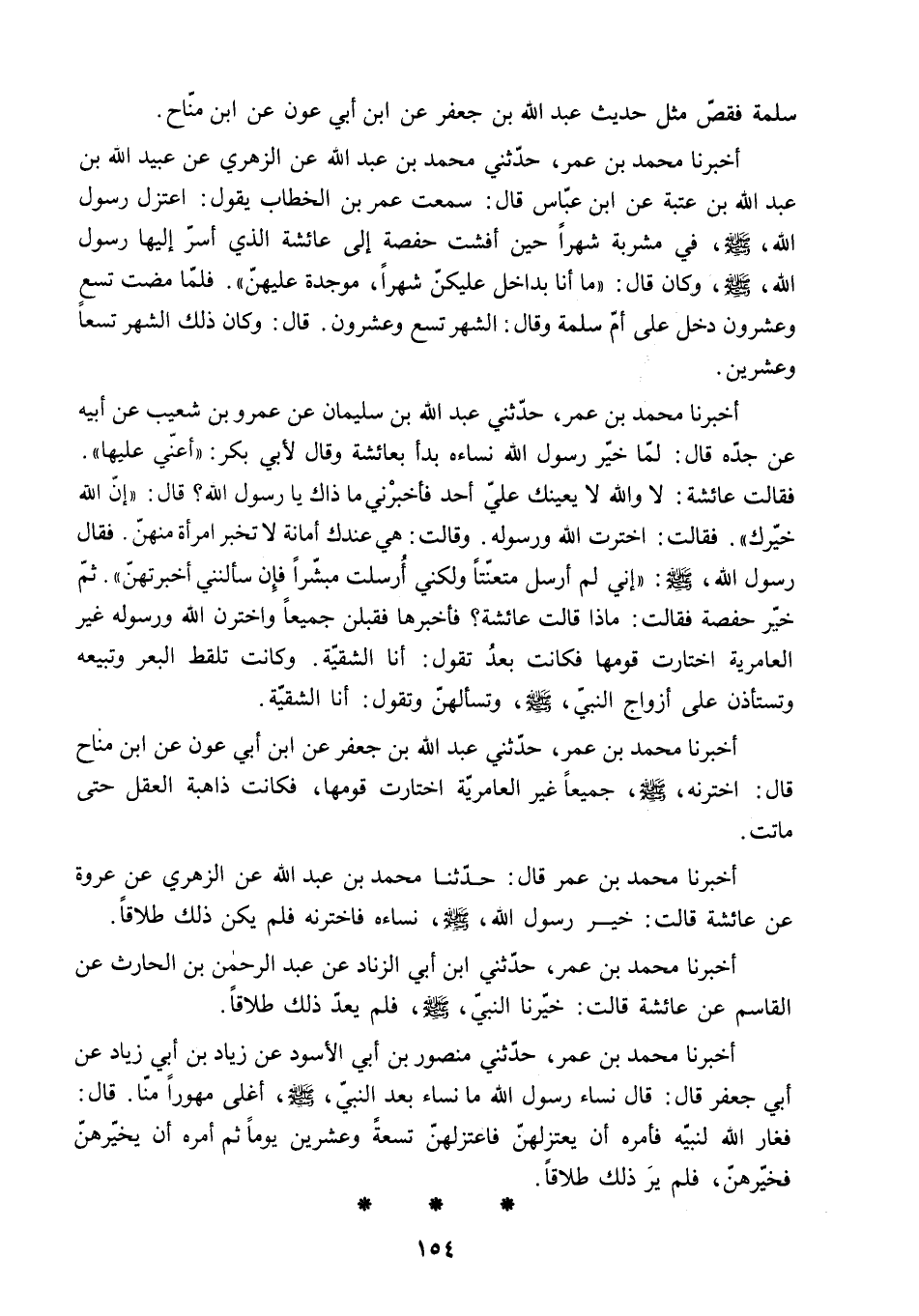 أَخْبَرَنَا مُحَمَّدُ بْنُ عُمَرَ قَالَ: حَدَّثَنَا مُحَمَّدُ بْنُ عَبْدِ اللَّهِ عَنِ الزُّهْرِيِّ عَنْ عُرْوَةَ عَنْ عَائِشَةَ قَالَتْ: خُيِّرَ رَسُولُ اللَّهِ - صَلَّى اللَّهُ عَلَيْهِ وَسَلَّمَ - نساءه فَاخْتَرْنَهُ فَلَمْ يَكُنْ ذَلِكَ طَلاقًا.