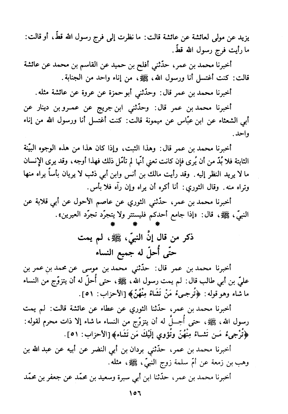 أَخْبَرَنَا مُحَمَّدُ بْنُ عُمَرَ قَالَ: حَدَّثَنِي مُحَمَّدُ بْنُ مُوسَى عَنْ مُحَمَّدِ بْنِ عُمَرَ بْنِ عَلِيِّ بْنِ أَبِي طَالِبٍ قَالَ: لَمْ يَمُتْ رَسُولُ اللَّهِ - صَلَّى اللَّهُ عَلَيْهِ وَسَلَّمَ - حَتَّى أُحِلَّ لَهُ أَنْ يَتَزَوَّجَ مِنَ النِّسَاءِ مَا شَاءَ وَهُوَ قَوْلُهُ: «تُرْجِي مَنْ تَشاءُ مِنْهُنَّ» الأحزاب: 51.