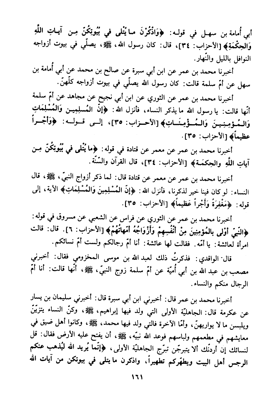أَخْبَرَنَا مُحَمَّدُ بْنُ عُمَرَ عَنِ الثَّوْرِيِّ عَنْ ابْنِ أَبِي نَجِيحٍ عَنْ مُجَاهِدٍ عَنْ أُمِّ سَلَمَةَ أَنَّهَا قَالَتْ: يَا رَسُولَ اللَّهِ مَا يَذْكُرُ النِّسَاءُ. فَأَنْزَلَ الله: «إِنَّ الْمُسْلِمِينَ وَالْمُسْلِماتِ وَالْمُؤْمِنِينَ وَالْمُؤْمِناتِ» الأحزاب: 35. إِلَى قَوْلِهِ: «وَأَجْراً عَظِيماً» الأحزاب: 35.