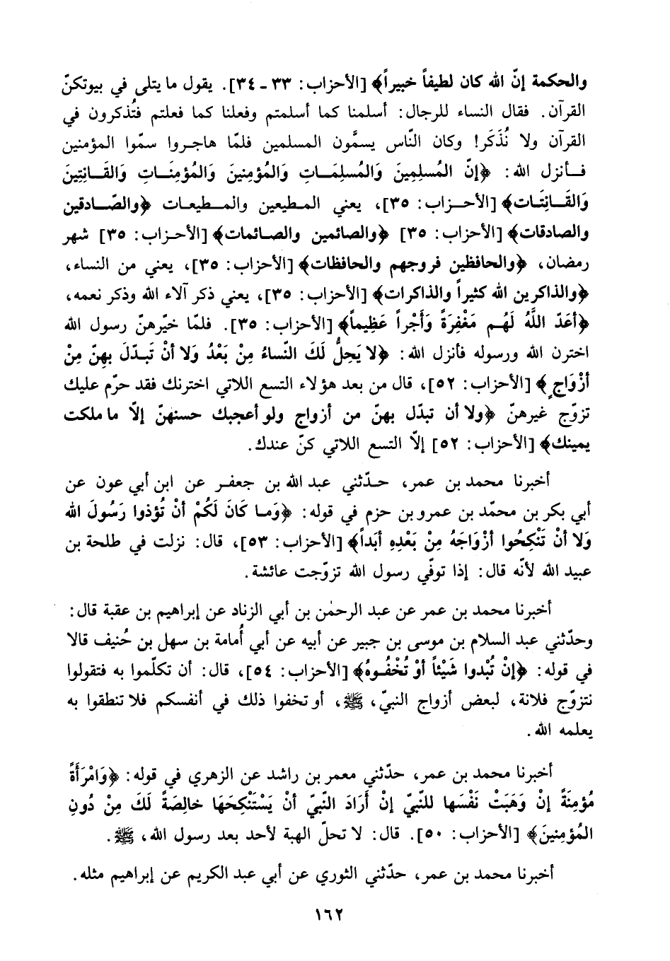 وَالْحِكْمَةِ إِنَّ اللَّهَ كانَ لَطِيفاً خَبِيراً» الأحزاب: 33- 34. يقول ما يتلى في بيوتكن الْقُرْآنُ. فَقَالَ النِّسَاءُ لِلرِّجَالِ: أَسْلَمْنَا كَمَا أَسْلَمْتُمْ وَفَعَلْنَا كَمَا فَعَلْتُمْ فَتُذْكَرُونَ فِي الْقُرْآنِ وَلا نُذَكَرُ! وَكَانَ النَّاسُ يُسَمَّوْنَ الْمُسْلِمِينَ فَلَمَّا هَاجَرُوا سُمُّوا الْمُؤْمِنِينَ فَأَنْزَلَ اللَّهُ: «إِنَّ الْمُسْلِمِينَ وَالْمُسْلِماتِ وَالْمُؤْمِنِينَ وَالْمُؤْمِناتِ وَالْقانِتِينَ وَالْقانِتاتِ» الأحزاب: 35. يَعْنِي الْمُطِيعِينَ والمطيعات «وَالصَّادِقِينَ وَالصَّادِقاتِ» الأحزاب: 35 «وَالصَّائِمِينَ وَالصَّائِماتِ» الأحزاب: 35 شَهْرَ رَمَضَانَ. «وَالْحافِظِينَ فُرُوجَهُمْ وَالْحافِظاتِ» الأحزاب: 35. يَعْنِي مِنَ النِّسَاءِ.