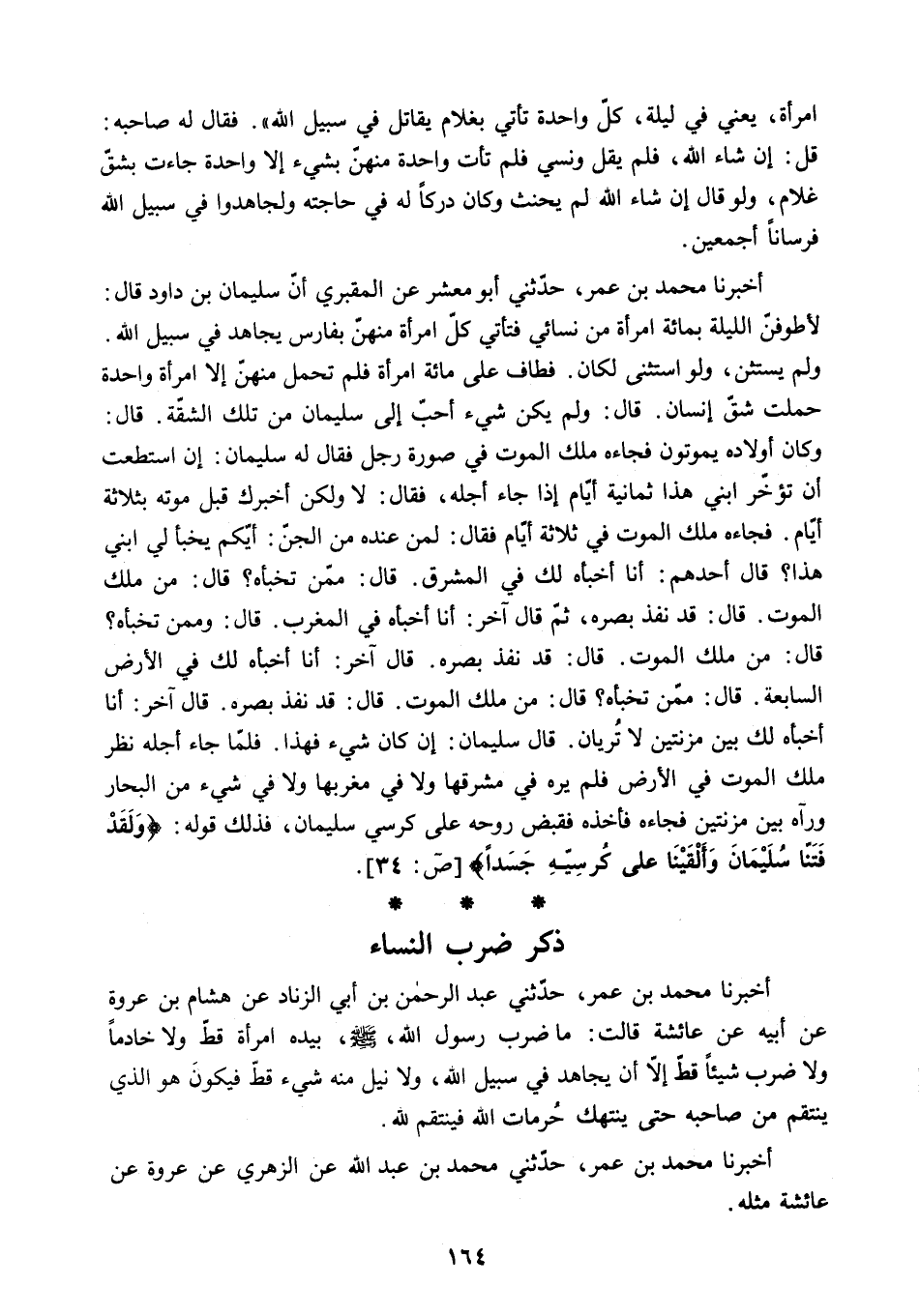 لأَطُوفَنَّ اللَّيْلَةَ بِمِائَةِ امْرَأَةٍ مِنْ نِسَائِي فَتَأْتِي كُلُّ امْرَأَةٍ مِنْهُنَّ بِفَارِسٍ يُجَاهِدُ فِي سَبِيلِ اللَّهِ.