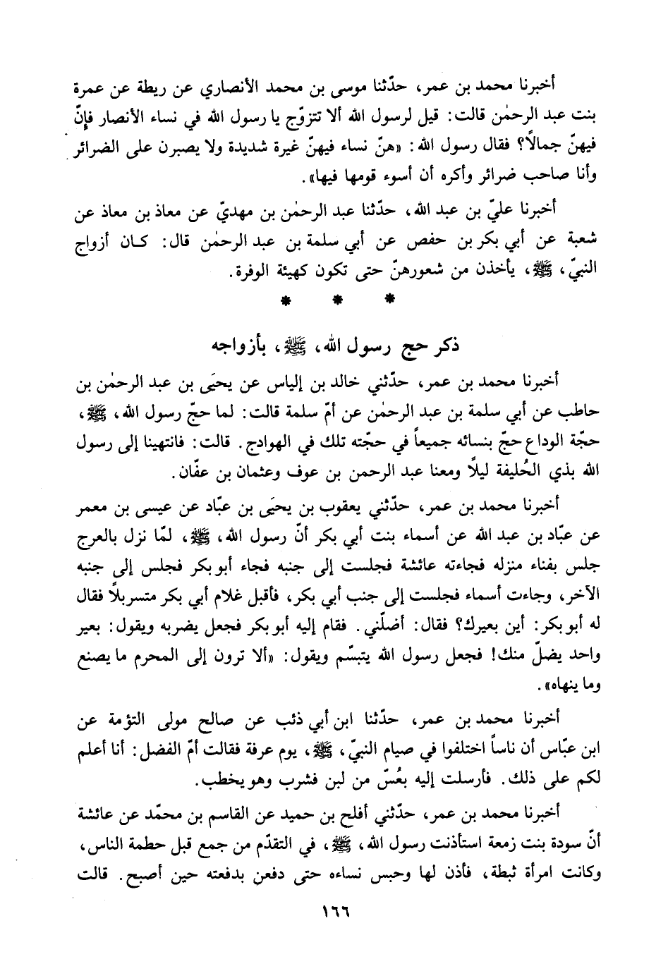 أَخْبَرَنَا مُحَمَّدُ بْنُ عُمَرَ. حَدَّثَنَا مُوسَى بْنُ مُحَمَّدٍ الأَنْصَارِيُّ عَنْ رَيْطَةَ عَنْ [عَمْرَةَ بِنْتِ عَبْدِ الرَّحْمَنِ قَالَتْ: قِيلَ لِرَسُولِ اللَّهِ أَلا تَتَزَوَّجُ يَا رَسُولَ اللَّهِ فِي نِسَاءِ الأَنْصَارِ فَإِنَّ فِيهِنَّ جَمَالا؟ فَقَالَ رَسُولُ اللَّهِ: هُنَّ نِسَاءٌ فِيهِنَّ غَيْرَةٌ شَدِيدَةٌ وَلا يَصْبِرْنَ عَلَى الضَّرَائِرِ وَأَنَا صَاحِبُ ضرائر وأكره أن أسوأ قَوْمَهَا فِيهَا] .