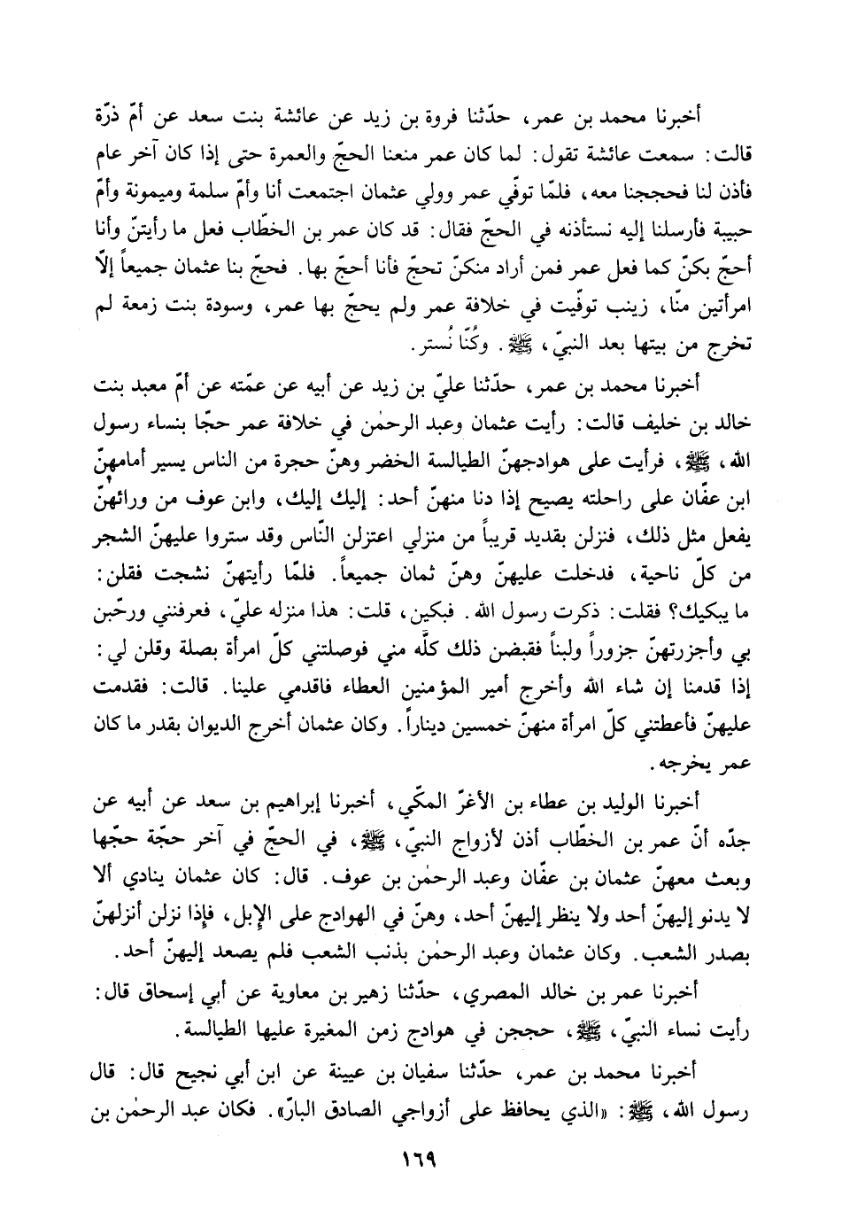 أَخْبَرَنَا الْوَلِيدُ بْنُ عَطَاءِ بْنِ الأَغَرِّ الْمَكِّيُّ. أَخْبَرَنَا إِبْرَاهِيمُ بْنُ سَعْدٍ عَنْ أَبِيهِ عَنْ جَدِّهِ أَنَّ عُمَرَ بْنَ الْخَطَّابِ أَذِنَ لأَزْوَاجِ النَّبِيِّ - صَلَّى اللَّهُ عَلَيْهِ وَسَلَّمَ - فِي الْحَجِّ فِي آخِرِ حَجَّةٍ حَجَّهَا وَبَعَثَ مَعَهُنَّ عُثْمَانَ بْنَ عَفَّانَ وَعَبْدَ الرَّحْمَنِ بْنَ عوف. قال: كان عثمان ينادي ألا لا يَدْنُو إِلَيْهِنَّ أَحَدٌ وَلا يَنْظُرُ إِلَيْهِنَّ أَحَدٌ. وَهُنَّ فِي الْهَوَادِجِ عَلَى الإِبِلِ. فَإِذَا نَزَلْنَ أَنْزَلَهُنَّ بِصَدْرِ الشِّعَبِ. وَكَانَ عُثْمَانُ وَعَبْدُ الرَّحْمَنِ بِذَنَبِ الشِّعَبِ فَلَمْ يَصْعَدْ إِلَيْهِنَّ أَحَدٌ.
