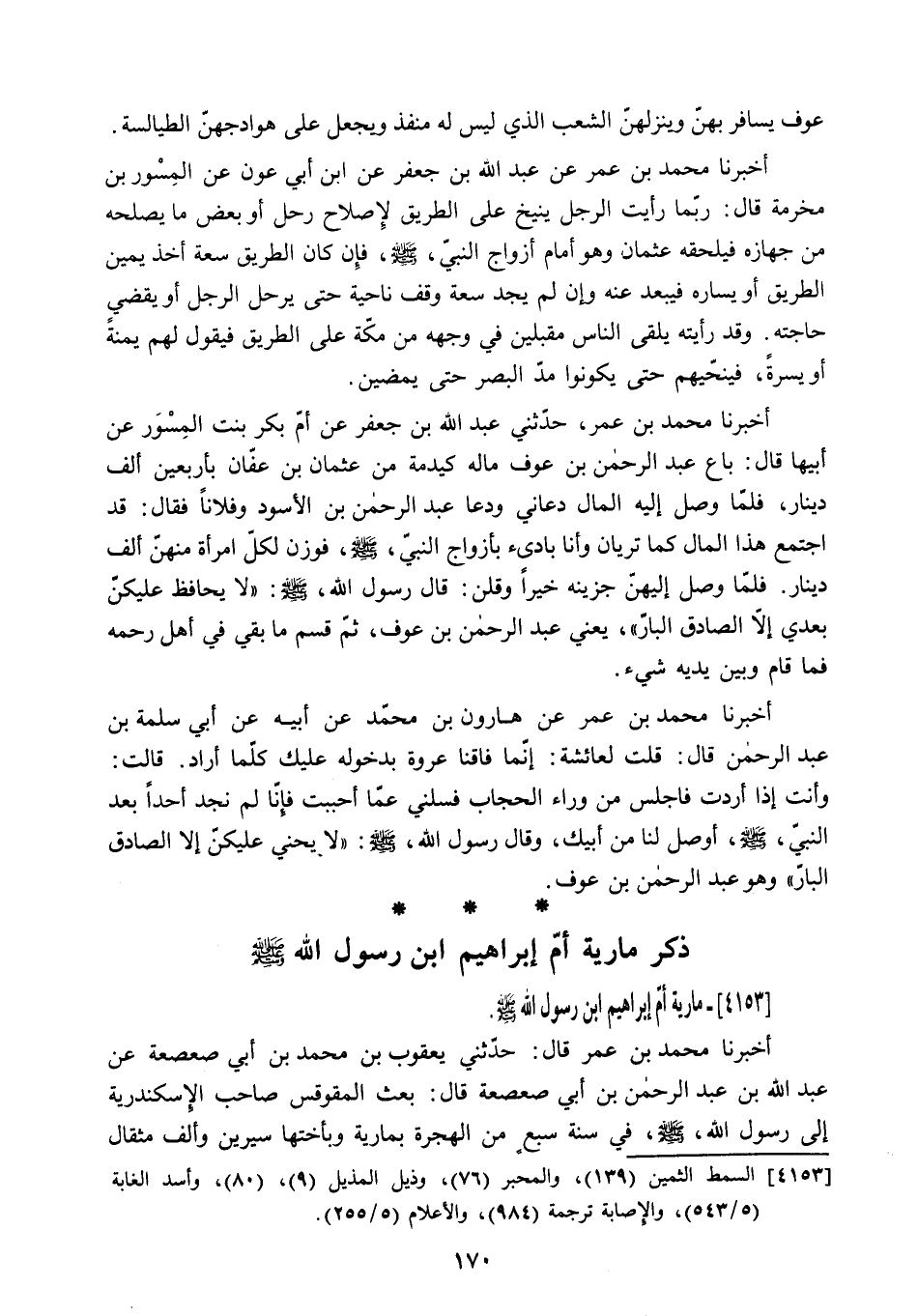 أَخْبَرَنَا مُحَمَّدُ بْنُ عُمَرَ عَنْ عَبْدِ اللَّهِ بْنُ جَعْفَرٍ عَنِ ابْنِ أَبِي عَوْنٍ عَنِ الْمِسْوَرِ بْنِ مَخْرَمَةَ قَالَ: رُبَّمَا رَأَيْتُ الرَّجُلَ يُنِيخُ عَلَى الطَّرِيقِ لإِصْلاحِ رَحْلٍ أَوْ بَعْضِ مَا يُصْلِحُهُ مِنْ جِهَازِهِ فَيَلْحَقُهُ عُثْمَانُ وَهُوَ أَمَامَ أَزْوَاجِ النَّبِيِّ - صَلَّى اللَّهُ عَلَيْهِ وَسَلَّمَ - فَإِنْ كَانَ الطَّرِيقُ سَعَةً أَخَذَ يَمِينَ الطَّرِيقِ أَوْ يَسَارَهُ فَيَبْعَدُ عَنْهُ وَإِنْ لَمْ يَجِدْ سَعَةً وَقَفَ نَاحِيَةً حَتَّى يَرْحَلَ الرَّجُلُ أَوْ يَقْضِيَ حَاجَتَهُ. وَقَدْ رَأَيْتُهُ يَلْقَى النَّاسَ مُقْبِلِينَ فِي وَجْهِهِ مِنْ مَكَّةَ عَلَى الطَّرِيقِ فَيَقُولُ لَهُمْ يُمْنَةً أَوْ يُسْرَةً. فَيُنَحِّيهِمْ حَتَّى يَكُونُوا مَدَّ الْبَصَرِ حَتَّى يَمْضِينَ.