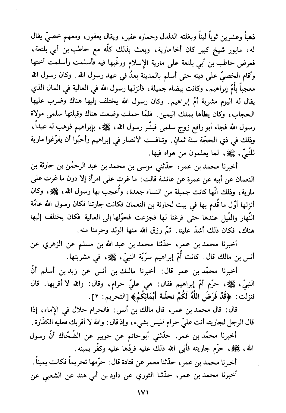 أَخْبَرَنَا مُحَمَّدُ بْنُ عُمَرَ قَالَ: أَخْبَرَنَا مَالِكُ بْنُ أَنَسٍ عَنْ زَيْدِ بْنِ أَسْلَمَ أَنَّ النَّبِيَّ - صَلَّى اللَّهُ عَلَيْهِ وَسَلَّمَ - حَرَّمَ أُمَّ إِبْرَاهِيمَ فَقَالَ: هِيَ عَلَيَّ حَرَامٌ. وَقَالَ: وَاللَّهِ لا أَقْرَبُهَا. قَالَ فَنَزَلَتْ: «قَدْ فَرَضَ اللَّهُ لَكُمْ تَحِلَّةَ أَيْمانِكُمْ» التحريم: 2.