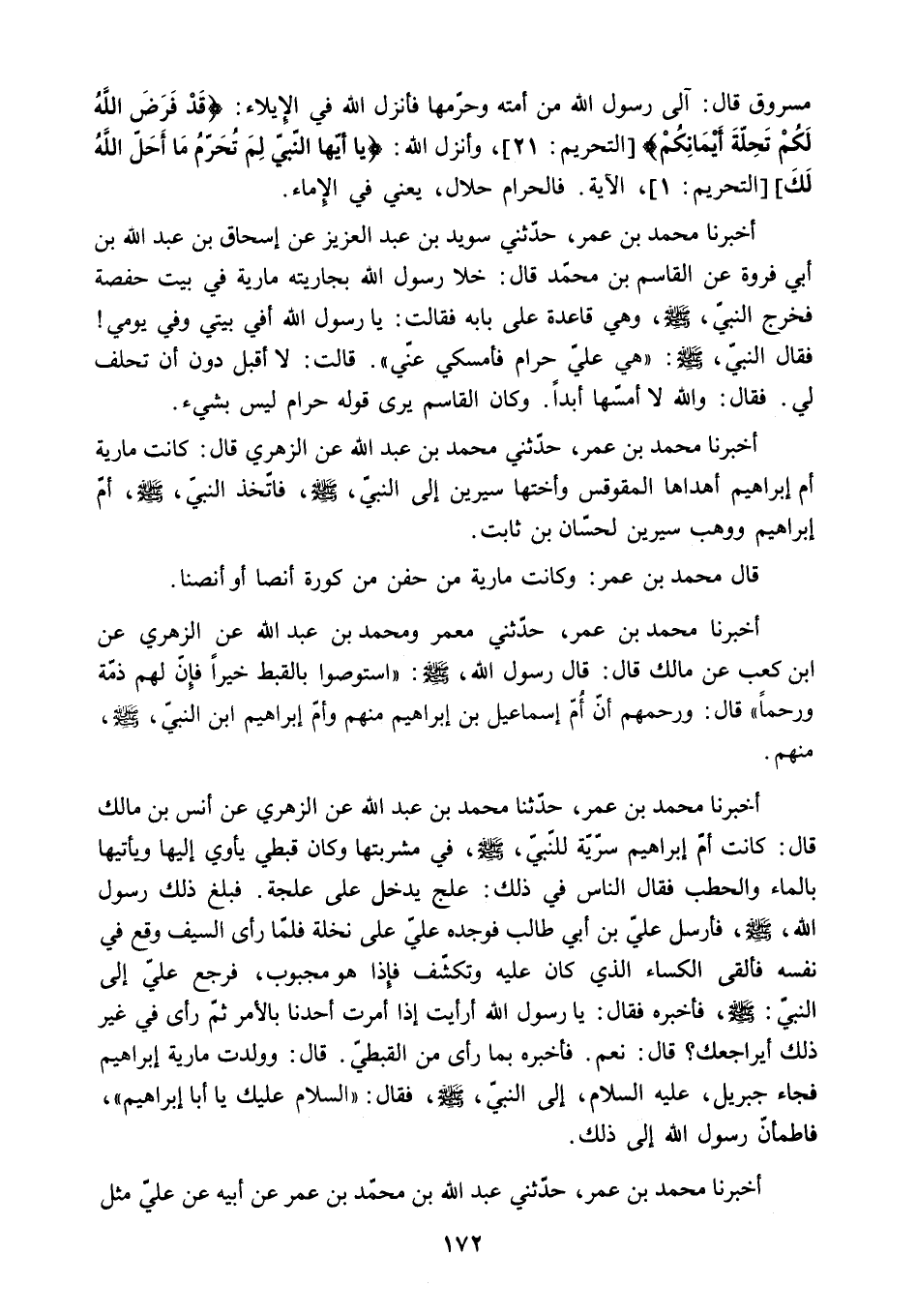 أَخْبَرَنَا مُحَمَّدُ بْنُ عُمَرَ. حَدَّثَنِي سُوَيْدُ بْنُ عَبْدِ الْعَزِيزِ عَنْ إِسْحَاقَ بْنِ عَبْدِ اللَّهِ بْنِ أَبِي فَرْوَةَ عَنِ الْقَاسِمِ بْنِ مُحَمَّدٍ قَالَ: [خَلا رَسُولُ اللَّهِ بِجَارِيَتِهِ مَارِيَةَ فِي بَيْتِ حَفْصَةَ فَخَرَجَ النَّبِيُّ - صَلَّى اللَّهُ عَلَيْهِ وَسَلَّمَ - وَهِيَ قَاعِدَةٌ عَلَى بَابِهِ فَقَالَتْ: يَا رَسُولَ اللَّهِ أَفِي بَيْتِي وَفِي يَوْمِي! فَقَالَ النبي. ص: هِيَ عَلَيَّ حَرَامٌ فَأَمْسِكِي عَنِّي. قَالَتْ: لا أَقْبَلُ دُونَ أَنْ تَحْلِفَ لِي. فَقَالَ: وَاللَّهِ لا أَمَسُّهَا أَبَدًا. وَكَانَ الْقَاسِمُ يَرَى قَوْلَهُ حَرَامٌ لَيْسَ بِشَيْءٍ] .