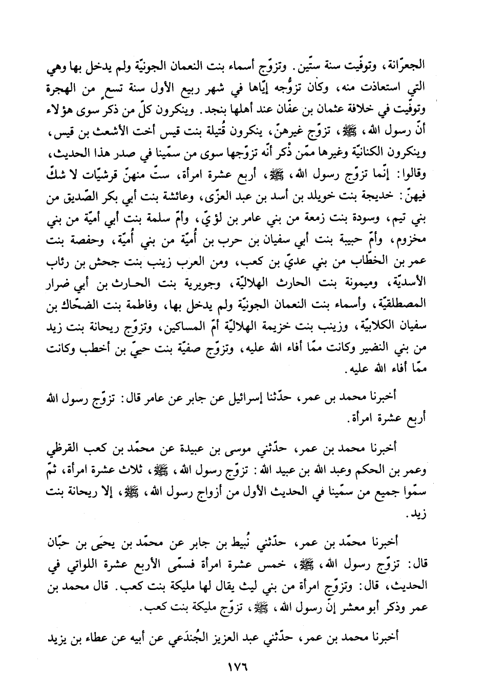 وَقَالُوا: إِنَّمَا تَزَوَّجَ رَسُولُ اللَّهِ - صَلَّى اللَّهُ عَلَيْهِ وَسَلَّمَ - أَرْبَعَ عَشْرَةَ امْرَأَةً. سِتٌّ مِنْهُنَّ قُرَشِيَّاتٌ لا شَكَّ فِيهِنَّ: خَدِيجَةُ بِنْتُ خُوَيْلِدِ بْنِ أَسَدِ بْنِ عَبْدِ الْعُزَّى. وَعَائِشَةُ بِنْتُ أَبِي بَكْرٍ الصِّدِّيقُ مِنْ بني تيم. وَسَوْدَةُ بِنْتُ زَمْعَةَ مِنْ بَنِي عَامِرِ بْنِ لُؤَيٍّ. وَأُمُّ سَلَمَةَ بِنْتُ أَبِي أُمَيَّةَ مِنْ بَنِي مَخْزُومٍ. وَأُمُّ حَبِيبَةَ بِنْت أَبِي سُفْيَان بْن حَرْبِ بْن أُمَيَّةَ مِنْ بَنِي أُمَيَّةَ. وَحَفْصَةُ بِنْتُ عُمَر بْن الْخَطَّابِ مِنْ بَنِي عَدِيِّ بْن كَعْبٍ. وَمِنَ الْعَرَبِ زَيْنَبُ بِنْتُ جَحْشِ بْنِ رِئَابٍ الأَسَدِيَّةُ. وَمَيْمُونَةُ بِنْتُ الْحَارِثِ الْهِلالِيَّةُ. وَجُوَيْرِيَةُ بِنْتُ الْحَارِثِ بْنِ أَبِي ضِرَارٍ الْمُصْطَلِقِيَّةُ. وَأَسْمَاءُ بِنْتُ النُّعْمَانُ الْجَوْنِيَّةُ وَلَمْ يَدْخُلْ بِهَا. وَفَاطِمَةُ بِنْتُ الضَّحَّاكِ بْنِ سُفْيَانَ الْكِلابِيَّةُ. وَزَيْنَبُ بِنْتُ خُزَيْمَةَ الْهِلالِيَّةُ أُمُّ الْمَسَاكِينِ. وَتَزَوَّجَ رَيْحَانَةَ بِنْتَ زَيْدٍ مِنْ بَنِي النَّضِيرِ وَكَانَتْ مِمَّا أَفَاءَ اللَّهُ عَلَيْهِ. وَتَزَوَّجَ صَفِيَّةَ بِنْتَ حُيَيِّ بْنِ أَخْطَبَ وَكَانَتْ مِمَّا أَفَاءَ اللَّهُ عَلَيْهِ.
