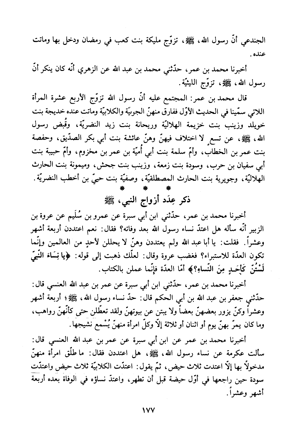 قَالَ مُحَمَّدُ بْنُ عُمَرَ: الْمُجْتَمَعُ عَلَيْهِ أَنَّ رَسُولَ اللَّهِ تَزَوَّجَ الأَرْبَعَ عَشْرَةَ الْمَرْأَةَ اللاتِي سَمَّيْنَا فِي الْحَدِيثِ الأَوَّلِ فَفَارَقَ مِنْهُنَّ الْجُونِيَّةَ وَالْكِلابِيَّةَ وَمَاتَتْ عِنْدَهُ خَدِيجَةُ بِنْتُ خُوَيْلِدٍ وَزَيْنَبُ بِنْتُ خُزَيْمَةَ الْهِلالِيَّةُ وَرَيْحَانَةُ بِنْتُ زَيْدٍ النَّضْرِيَّةِ. وَقَبَضَ رَسُول اللَّهِ - صَلَّى اللَّهُ عَلَيْهِ وَسَلَّمَ - عَنْ تِسْعٍ لا اخْتِلافَ فِيهِنَّ وَهُنَّ عَائِشَةُ بِنْتُ أَبِي بَكْرٍ الصِّدِّيقِ. وَحَفْصَةُ بِنْتُ عُمَرَ بْنِ الْخَطَّابِ. وَأُمُّ سَلَمَةَ بِنْتُ أَبِي أُمَيَّةَ بْنِ عُمَرَ بْنِ مَخْزُومٍ. وَأُمُّ حَبِيبَةَ بِنْتُ أَبِي سُفْيَانَ بْنِ حَرْبٍ. وَسَوْدَةُ بِنْتُ زَمْعَةَ. وَزَيْنَبُ بِنْتُ جَحْشٍ. وَمَيْمُونَةُ بِنْتُ الْحَارِثِ الْهِلالِيَّةُ. وَجُوَيْرِيَةُ بِنْتُ الْحَارِثِ الْمُصْطَلَقِيَّةُ. وَصَفِيَّةُ بِنْتُ حُيَيِّ بْنِ أَخْطَبَ النَّضْرِيَّةُ.