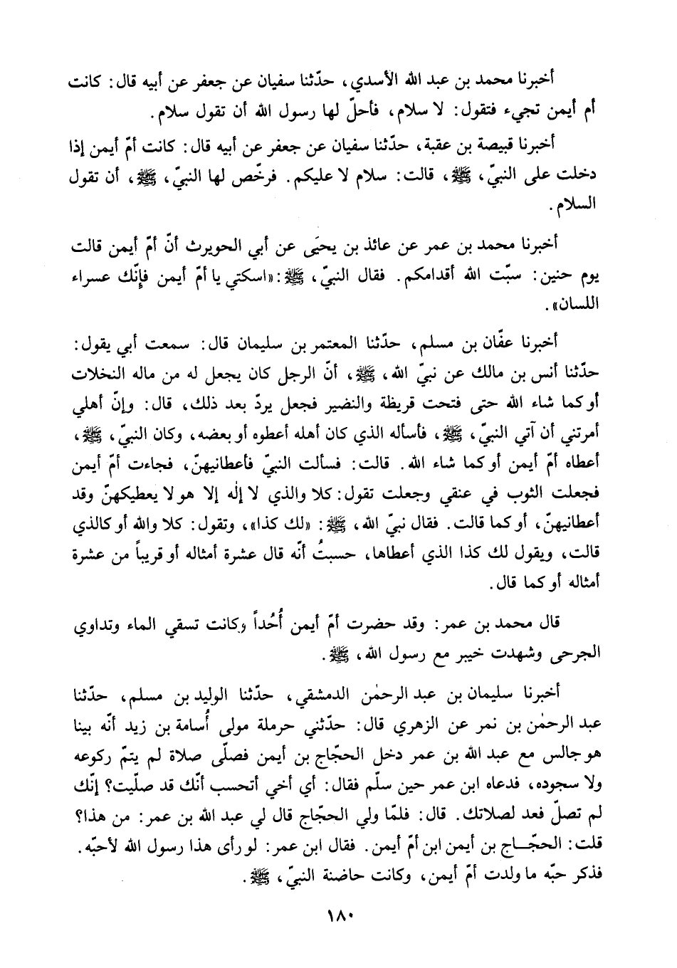 أَخْبَرَنَا مُحَمَّدُ بْنُ عَبْدِ اللَّهِ الأَسَدِيُّ. حَدَّثَنَا سُفْيَانُ عَنْ جَعْفَرٍ عَنْ أَبِيهِ قَالَ: كَانَتْ أُمُّ أَيْمَنَ تَجِيءُ فَتَقُولُ: لا سَلامَ. فَأَحَلَّ لَهَا رَسُولُ اللَّهِ أَنْ تَقُولَ سَلامٌ.