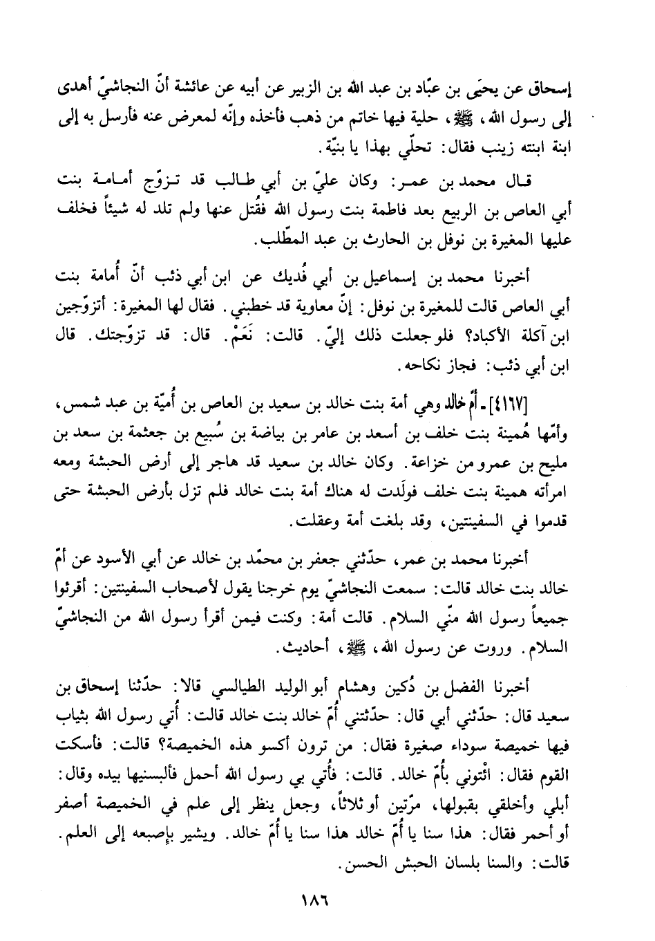 إِسْحَاقَ عَنْ يَحْيَى بْنِ عَبَّادِ بْنِ عَبْدِ اللَّهِ بْنِ الزُّبَيْرِ عَنْ أبيه عن عائشة أَنَّ النَّجَاشِيَّ أَهْدَى إِلَى رَسُولِ اللَّهِ - صَلَّى اللَّهُ عَلَيْهِ وَسَلَّمَ - حِلْيَةً فِيهَا خَاتَمٌ مِنْ ذَهَبٍ فَأَخَذَهُ وَإِنَّهُ لَمُعْرِضٌ عَنْهُ فَأَرْسَلَ بِهِ إِلَى [ابْنَةِ ابْنَتِهِ زَيْنَبَ فَقَالَ: تَحَلَّيْ بِهَذَا يَا بُنَيَّةُ] .