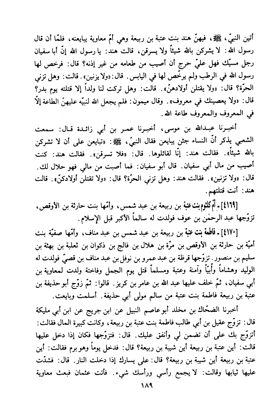 أَتَيْنَ النَّبِيَّ - صَلَّى اللَّهُ عَلَيْهِ وَسَلَّمَ - فِيهِنَّ هِنْدُ بِنْتُ عُتْبَةَ بْنِ رَبِيعَةَ وَهِيَ أُمُّ مُعَاوِيَةَ يُبَايِعْنَهُ. فَلَمَّا أَنْ قَالَ رَسُولُ اللَّهِ: لا يُشْرِكْنَ بِاللَّهِ شَيْئًا وَلا يَسْرِقْنَ. قَالَتْ هِنْدٌ: يَا رَسُولَ اللَّهِ إِنَّ أَبَا سُفْيَانَ رَجُلٌ مِسِّيكٌ فَهَلْ عَلَيَّ حَرَجٌ أَنْ أُصِيبَ مِنْ طَعَامِهِ مِنْ غَيْرِ إِذْنِهِ؟ قَالَ: فَرَخَّصَ لَهَا رَسُولُ اللَّهِ فِي الرُّطَبِ وَلَمْ يُرَخِّصْ لها فِي الْيَابِسِ. قَالَ: وَلا يَزْنِينَ. قَالَتْ: وَهَلْ تَزْنِي الْحُرَّةُ؟ قَالَ: وَلا يُقْتَلْنَ أَوْلادَهُنَّ. قَالَتْ: وَهَلْ تَرَكْتَ لَنَا وَلَدًا إِلا قَتَلْتَهُ يَوْمَ بَدْرٍ؟