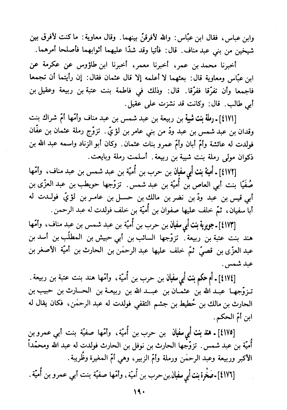 بْن حرب بْن أُمَيَّةُ بْنُ عَبْدِ شَمْسِ بْنِ عَبْدِ مَنَافِ. وأمها صفيا بنت أبي العاص بْن أمية بْن عَبْد شمس. تزوجها حويطب بن عبد العزى بن أبي قيس بن عبد ود بن نضر بْنِ مَالِكِ بْنِ حِسْلِ بْنِ عَامِرِ بْنِ لؤي فولدت له أبا سفيان. ثم خلف عليها صفوان بن أمية بن خلف فولدت له عبد الرحمن.