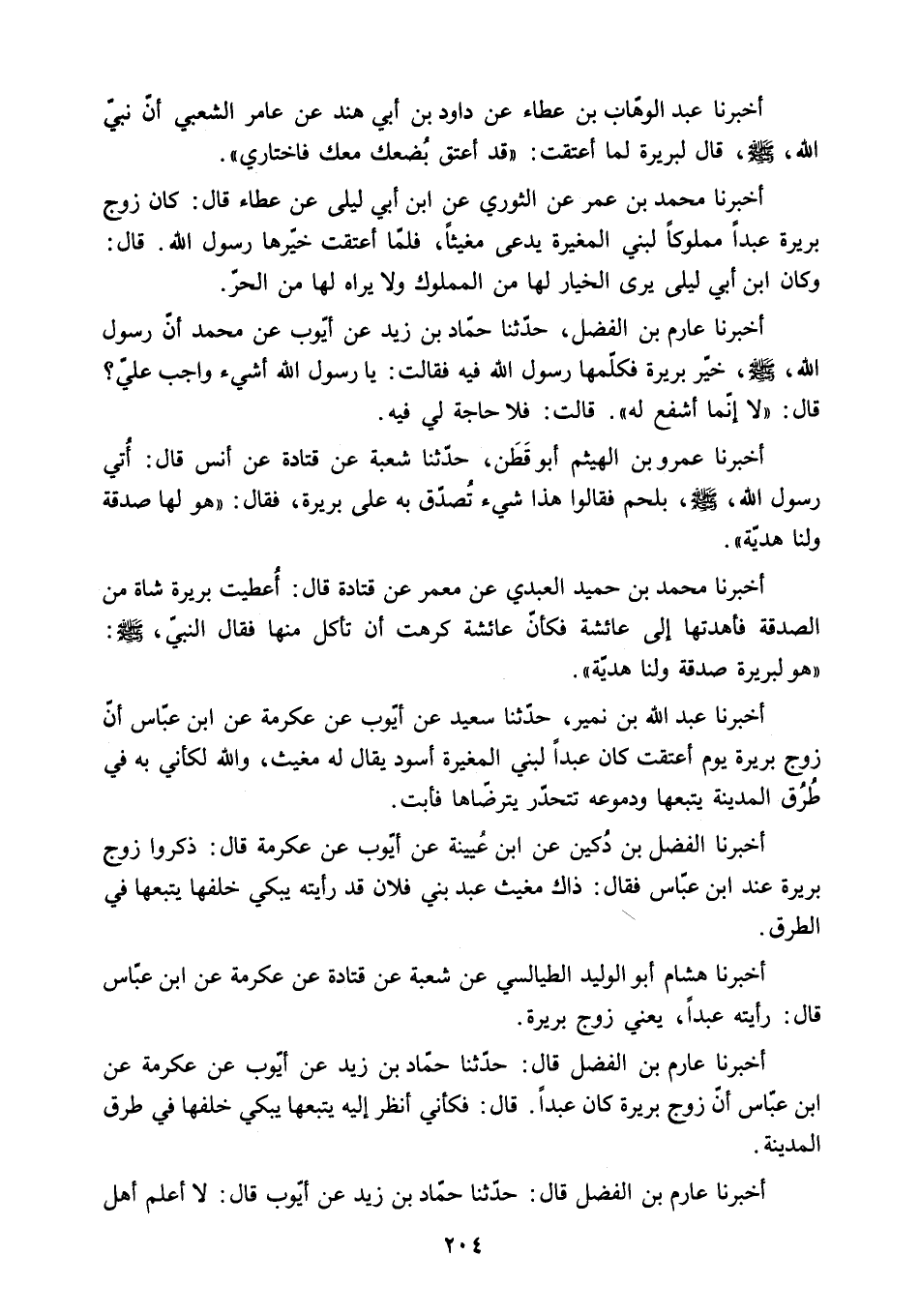أَخْبَرَنَا عَارِمُ بْنُ الْفَضْلِ قَالَ: حَدَّثَنَا حَمَّادُ بْنُ زَيْدٍ عَنْ أَيُّوبَ عَنْ عِكْرِمَةَ عَنِ ابْنِ عَبَّاسٍ أَنَّ زَوْجَ بَرِيرَةَ كَانَ عَبْدًا. قَالَ: فَكَأَنِّي أَنْظُرُ إِلَيْهِ يَتْبَعُهَا يَبْكِي خَلْفَهَا فِي طُرُقِ الْمَدِينَةِ.