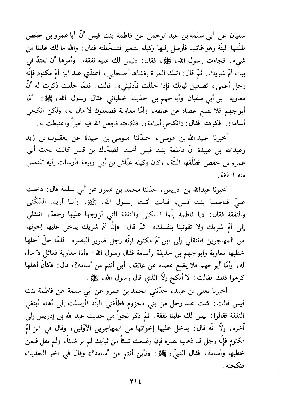 سُفْيَانَ عَنْ أَبِي سَلَمَةَ بْنِ عَبْدِ الرَّحْمَنِ عَنْ فَاطِمَةَ بِنْتِ قَيْسٍ أَنَّ [أَبَا عَمْرِو بْنَ حَفْصٍ طَلَّقَهَا الْبَتَّةَ وَهُوَ غَائِبٌ فَأَرْسَلَ إِلَيْهَا وَكِيلَهُ بِشَعِيرٍ فَتَسَخَّطَتْهُ فَقَالَ: وَاللَّهِ مَا لَكِ عَلَيْنَا مِنْ شَيْءٍ. فَجَاءَتْ رَسُولَ اللَّهِ - صَلَّى اللَّهُ عَلَيْهِ وَسَلَّمَ - فَقَالَ: لَيْسَ لَكِ عَلَيْهِ نَفَقَةٌ. وَأَمَرَهَا أَنْ تَعْتَدَّ فِي بَيْتِ أُمِّ شَرِيكٍ. ثُمَّ قَالَ: تِلْكَ الْمَرْأَةُ يَغْشَاهَا أَصْحَابِي. اعْتَدِّي عِنْدَ ابْنِ أُمِّ مَكْتُومٍ فَإِنَّهُ رَجُلٌ أَعْمَى. تَضَعِينَ ثِيَابَكِ فَإِذَا حَلَلْتِ فَآذِنِينِي. قَالَتْ: فَلَمَّا حَلَلْتُ ذَكَرْتُ لَهُ أَنَّ مُعَاوِيَةَ بْنَ أَبِي سُفْيَانَ وَأَبَا جَهْمِ بْنَ حذيفة خطباني فقال رسول الله. ص: أَمَّا أَبُو جَهْمٍ فَلا يَضَعُ عَصَاهُ عَنْ عَاتِقِهِ. وَأَمَّا مُعَاوِيَةُ فَصُعْلُوكٌ لا مَالَ لَهُ. وَلَكِنِ انْكِحِي أُسَامَةَ. فَكَرِهْتُهُ فَقَالَ: انْكِحِي أُسَامَةَ. فَنَكَحَتْهُ فَجَعَلَ اللَّهُ فِيهِ خَيْرًا وَاغْتَبَطْتُ بِهِ] .