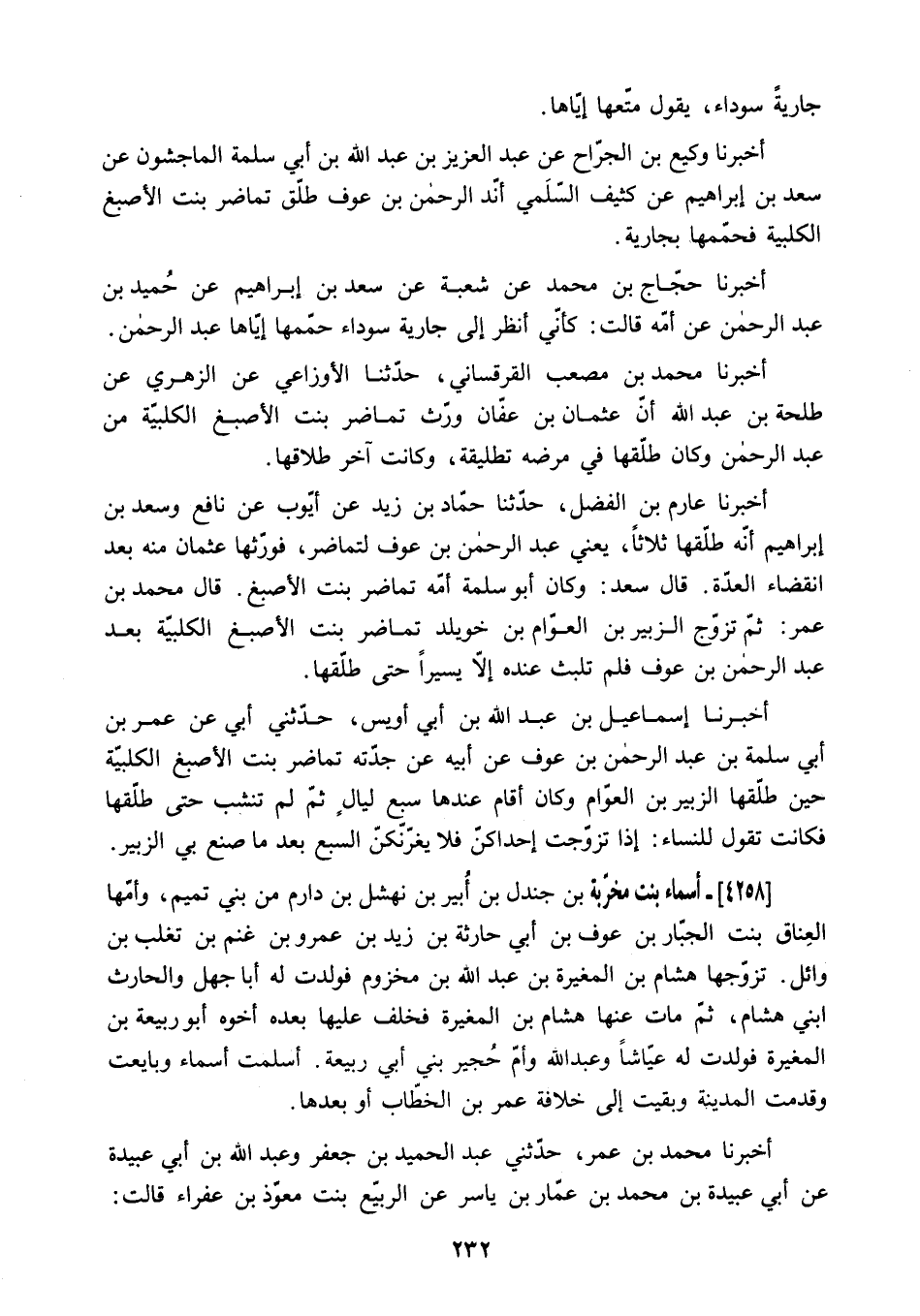 أَخْبَرَنَا عَارِمُ بْنُ الْفَضْلِ. حَدَّثَنَا حَمَّادُ بْنُ زَيْدٍ عَنْ أَيُّوبَ عَنْ نَافِعٍ وَسَعْدِ بْنِ إِبْرَاهِيمَ أَنَّهُ طَلَّقَهَا ثَلاثًا. يَعْنِي عَبْدَ الرَّحْمَنِ بْنَ عَوْفٍ لِتُمَاضِرَ. فَوَرَّثَهَا عُثْمَانُ مِنْهُ بَعْدَ انْقِضَاءِ الْعِدَّةِ. قَالَ سَعْدٌ: وَكَانَ أَبُو سَلَمَةَ أُمُّهُ تُمَاضِرُ بِنْتُ الأَصْبَغِ. قَالَ مُحَمَّدُ بْنُ عُمَرَ: ثُمَّ تَزَوَّجَ الزُّبَيْرُ بْنُ الْعَوَّامِ بْنِ خُوَيْلِدٍ تُمَاضِرَ بِنْتَ الأَصْبَغِ الْكَلْبِيَّةَ بَعْدَ عَبْدِ الرَّحْمَنِ بْنِ عَوْفٍ فَلَمْ تَلْبَثْ عِنْدَهُ إِلا يَسِيرًا حَتَّى طَلَّقَهَا.