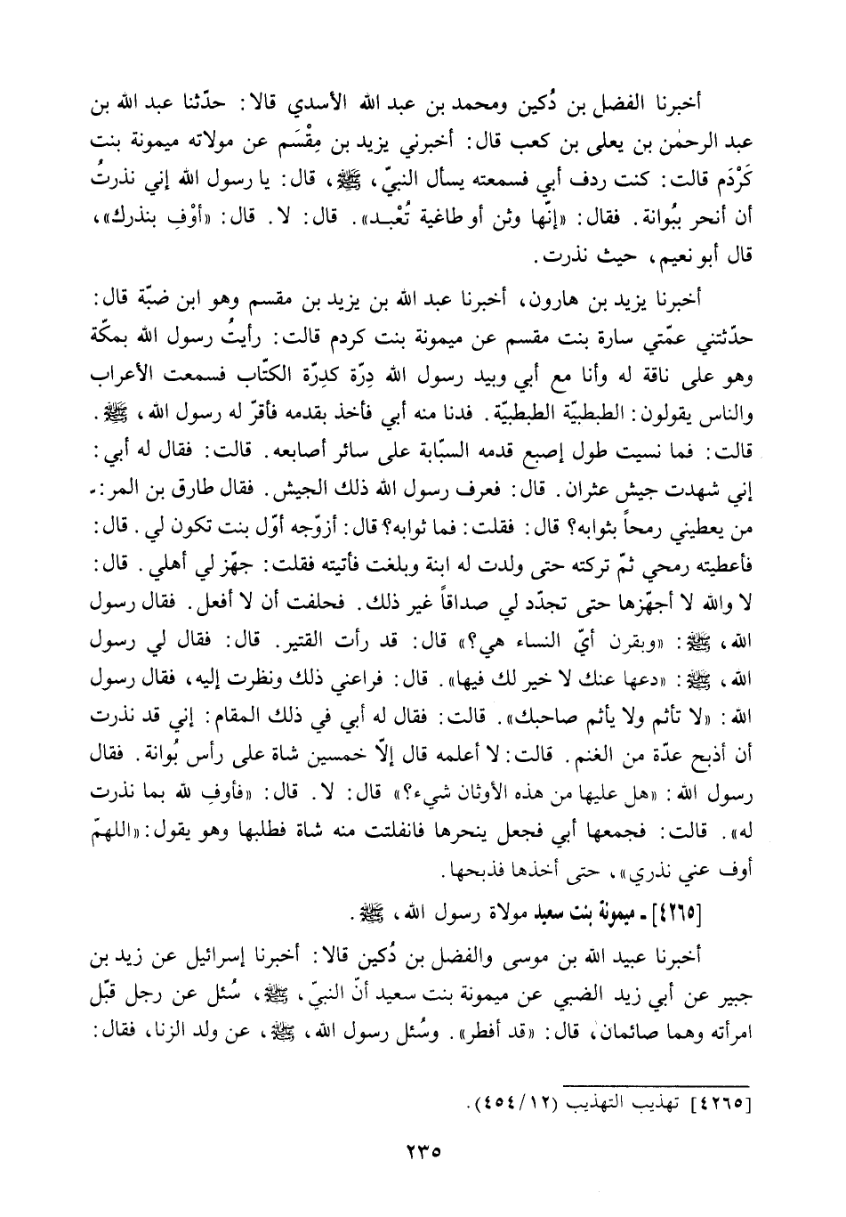 أَخْبَرَنَا الْفَضْلُ بْنُ دُكَيْنٍ وَمُحَمَّدُ بْنُ عَبْدِ اللَّهِ الأَسَدِيُّ قَالا: حَدَّثَنَا عَبْدُ اللَّهِ بْنُ عَبْدِ الرَّحْمَنِ بْنِ يَعْلَى بْنِ كَعْبٍ قَالَ: أخبرنا يَزِيدُ بْنُ مِقْسَمٍ عَنْ مَوْلاتِهِ مَيْمُونَةَ بِنْتِ كَرْدَمٍ قَالَتْ: [كُنْتُ رِدْفَ أَبِي فَسَمِعْتُهُ يَسْأَلُ النَّبِيَّ - صَلَّى اللَّهُ عَلَيْهِ وَسَلَّمَ - قَالَ: يَا رَسُولَ اللَّهِ إِنِّي نَذَرْتُ أَنْ أَنْحَرَ بِبُوَانَةَ. فَقَالَ: إِنَّهَا وَثَنٌ أَوْ طَاغِيَةٌ تُعْبَدُ. قَالَ: لا. قَالَ: أَوْفِ بِنَذْرِكَ.