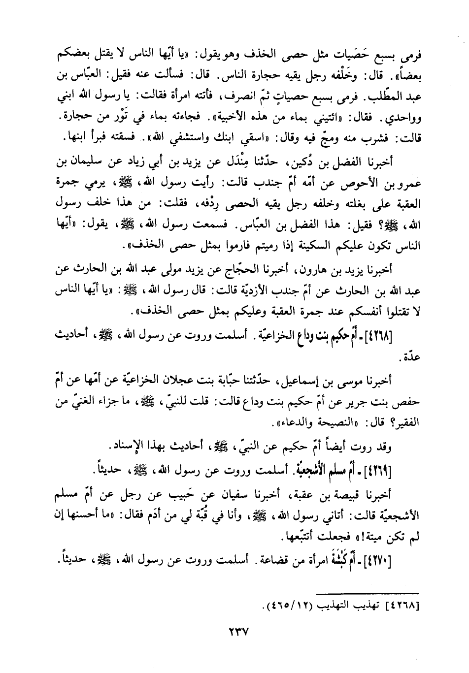 فَرَمَى بِسَبْعِ حَصَيَاتٍ مِثْلَ حَصَى الْخَذْفِ وَهُوَ يَقُولُ: يَا أَيُّهَا النَّاسُ لا يَقْتُلْ بَعْضُكُمْ بَعْضًا] . قَالَ: وَخَلْفَهُ رَجُلٌ يَقِيهِ حِجَارَةَ النَّاسِ. قَالَ: فَسَأَلْتُ عَنْهُ فَقِيلَ: الْعَبَّاسُ بْنُ عَبْدِ الْمُطَّلِبِ. فَرَمَى بِسَبْعِ حَصَيَاتٍ ثُمَّ انْصَرَفَ. فَأَتَتْهُ امْرَأَةٌ فَقَالَتْ: يَا رَسُولَ اللَّهِ ابْنِي وَوَاحِدِي. فَقَالَ: ائْتِينِي بِمَاءٍ مِنْ هَذِهِ الأَخْبِيَةِ. فَجَاءَتْهُ بِمَاءٍ فِي تَوْرٍ مِنْ حِجَارَةٍ.
