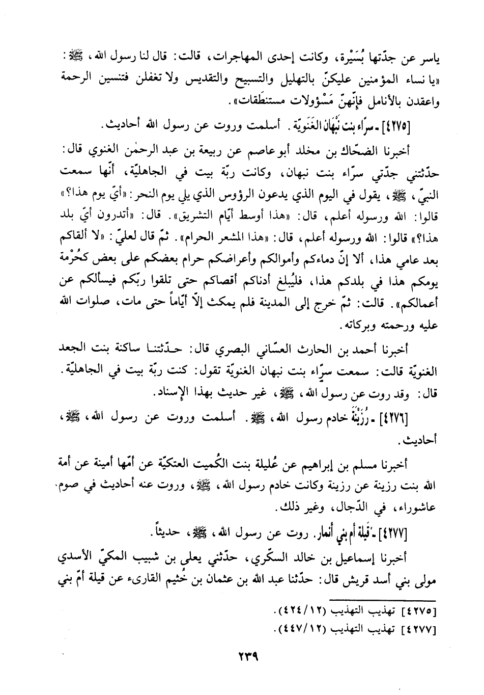 حَدَّثَتْنِي جَدَّتِي سَرَّاءُ بِنْتُ نَبْهَانَ. وَكَانَتْ رَبَّةَ بَيْتٍ فِي الْجَاهِلِيَّةِ. [أَنَّهَا سَمِعَتِ النَّبِيَّ - صَلَّى اللَّهُ عَلَيْهِ وَسَلَّمَ - يَقُولُ فِي الْيَوْمِ الَّذِي يدعون الرؤوس الَّذِي يَلِي يَوْمَ النَّحْرِ: أَيُّ يَوْمٍ هَذَا؟ قَالُوا: اللَّهُ وَرَسُولُهُ أَعْلَمُ. قَالَ: هَذَا أَوْسَطُ أَيَّامِ التَّشْرِيقِ. قَالَ: أَتَدْرُونَ أَيَّ بَلَدٍ هَذَا؟ قَالُوا: اللَّهُ وَرَسُولُهُ أَعْلَمُ. قَالَ: هَذَا الْمَشْعَرُ الْحَرَامُ. ثُمَّ قَالَ لَعَلِّي: لا أَلْقَاكُمُ بَعْدَ عَامِي هَذَا. أَلا إِنَّ دِمَاءَكُمْ وَأَمْوَالَكُمْ وَأَعْرَاضَكُمْ حَرَامٌ بَعْضُكُمْ عَلَى بَعْضٍ كَحُرْمَةِ يَوْمِكُمْ هَذَا فِي بَلَدِكُمْ هَذَا. فَلْيُبْلِغْ أَدْنَاكُمْ أَقْصَاكُمْ حَتَّى تَلْقَوْا رَبَّكُمْ فَيَسْأَلَكُمْ عَنْ أَعْمَالِكُمْ] . قَالَتْ: ثُمَّ خَرَجَ إِلَى الْمَدِينَةِ فَلَمْ يَمْكُثْ إِلا أَيَّامًا حَتَّى مَاتَ. صَلَوَاتُ اللَّهِ عَلَيْهِ وَرَحْمَتُهُ وَبَرَكَاتُهُ.