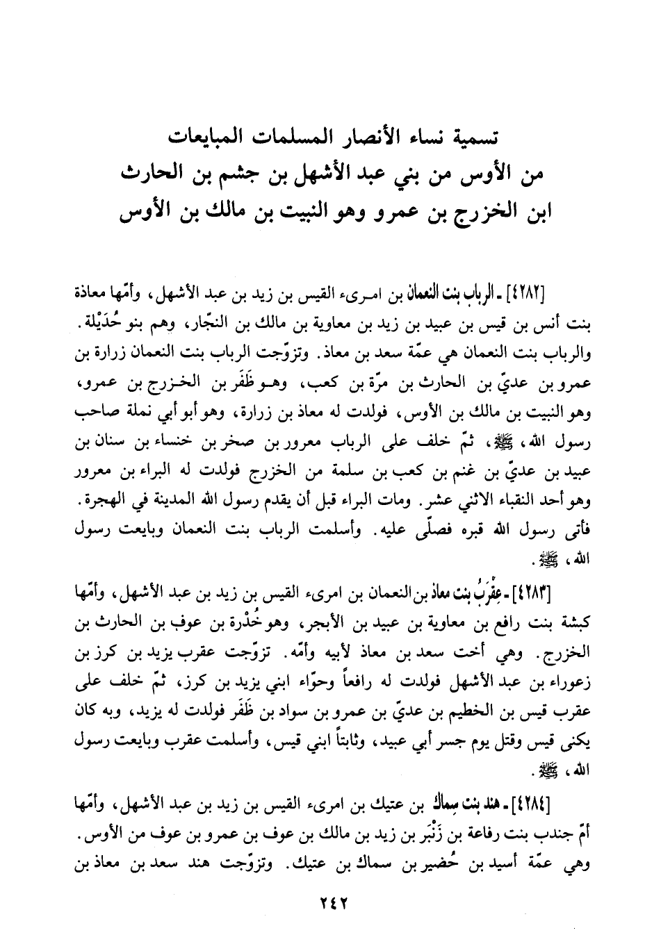 تَسْمِيَةُ نِسَاءِ الأَنْصَارِ الْمُسْلِمَاتِ الْمُبَايِعَاتِ مِنَ الأَوْسِ مِنْ بَنِي عَبْدِ الأَشْهَلِ بن جشم بن الحارث ابن الخزرج بن عمرو وهو النبيت بن مالك بن الأوس