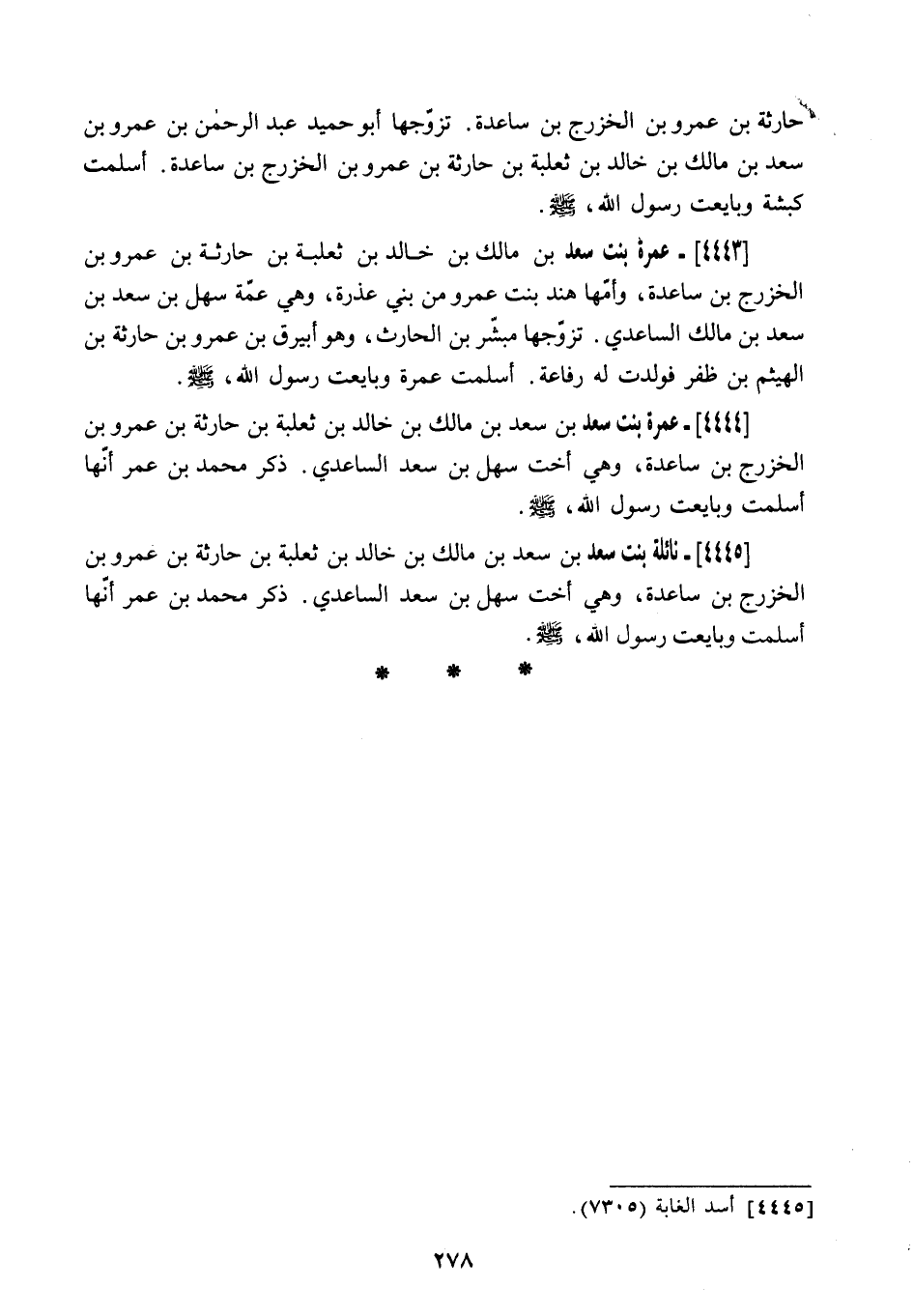 بْنُ سَعْدِ بْنِ مَالِكِ بْنِ خَالِدٍ بْن ثَعْلَبَة بن حارثة بْن عَمْرو بْن الخزرج بن ساعدة. وهي أخت سهل بن سعد الساعدي. ذكر محمد بن عمر أنها أسلمت وبايعت رسول الله - صَلَّى اللَّهُ عَلَيْهِ وَسَلَّمَ -