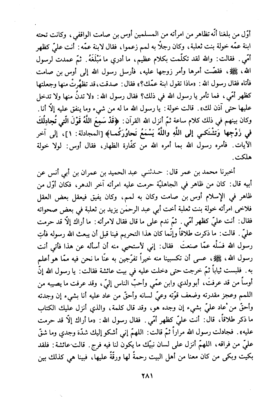 أَوَّلُ مَنْ بَلَغَنَا أَنَّهُ تَظَاهَرَ مِنَ امْرَأَتِهِ مِنَ الْمُسْلِمِينَ أَوْسُ بْنُ صَامِتٍ الْوَاقِفِيُّ. وَكَانَتْ تَحْتَهُ ابْنَةُ عَمِّهِ خَوْلَةُ بِنْتُ ثَعْلَبَةَ. وَكَانَ رَجُلا بِهِ لَمَمٌ زَعَمُوا. فَقَالَ لابْنَةِ عَمِّهِ: أَنْتِ عَلَيَّ كَظَهْرِ أُمِّي. فَقَالَتْ: وَاللَّهِ لَقَدْ تَكَلَّمْتَ بِكَلامٍ عَظِيمٍ. مَا أَدْرِي مَا مَبْلَغُهُ. ثُمَّ عَمَدَتْ لِرَسُولِ اللَّهِ - صَلَّى اللَّهُ عَلَيْهِ وَسَلَّمَ - فَقَصَّتْ أَمْرَهَا وَأَمْرَ زَوْجِهَا عَلَيْهِ. فَأَرْسَلَ رَسُولُ اللَّهِ إِلَى أَوْسِ بْنِ صَامِتٍ فَأَتَاهُ فَقَالَ رَسُولُ اللَّهِ: مَاذَا تَقُولُ ابْنَةُ عَمِّكَ؟ فَقَالَ: صَدَقَتْ. قَدْ تَظَهَّرْتُ مِنْهَا وَجَعَلْتُهَا كَظَهْرِ أُمِّي. فَمَا تَأْمُرُ يَا رَسُولَ اللَّهِ فِي ذَلِكَ؟ [فَقَالَ رَسُولُ اللَّهِ: لا تَدْنُ مِنْهَا وَلا تَدْخُلْ عَلَيْهَا حَتَّى آذَنَ لَكَ] . قَالَتْ خَوْلَةُ: يَا رَسُولَ اللَّهِ مَا لَهُ مِنْ شَيْءٍ وَمَا يُنْفِقُ عَلَيْهِ إِلا أَنَا.