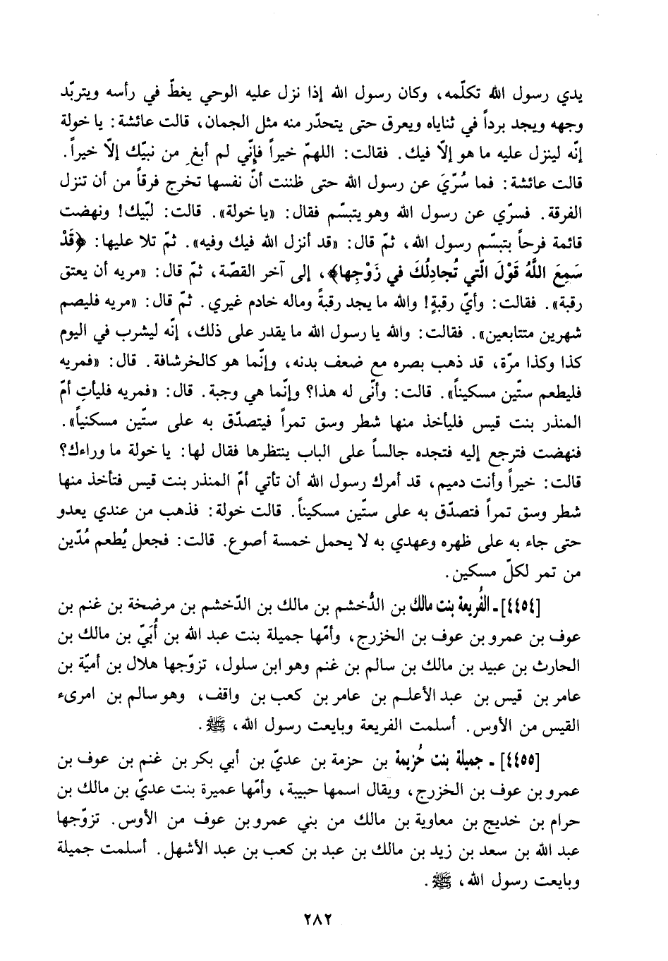 يَدَيْ رَسُولِ اللَّهِ. تُكَلِّمُهُ. وَكَانَ رَسُولُ اللَّهِ إِذَا نَزَلَ عَلَيْهِ الْوَحْيُ يَغِطُّ فِي رَأْسِهِ وَيَتَرَبَّدُ وَجْهُهُ وَيَجِدُ بَرْدًا فِي ثَنَايَاهُ وَيَعْرَقُ حَتَّى يَتَحَدَّرُ مِنْهُ مِثْلُ الْجُمَانِ. قَالَتْ عَائِشَةُ: يَا خَوْلَةُ إِنَّهُ لَيَنْزِلُ عَلَيْهِ مَا هُوَ إِلا فِيكِ. فَقَالَتْ: اللَّهُمَّ خَيْرًا فَإِنِّي لَمْ أَبْغِ مِنْ نَبِيِّكَ إِلا خَيْرًا.