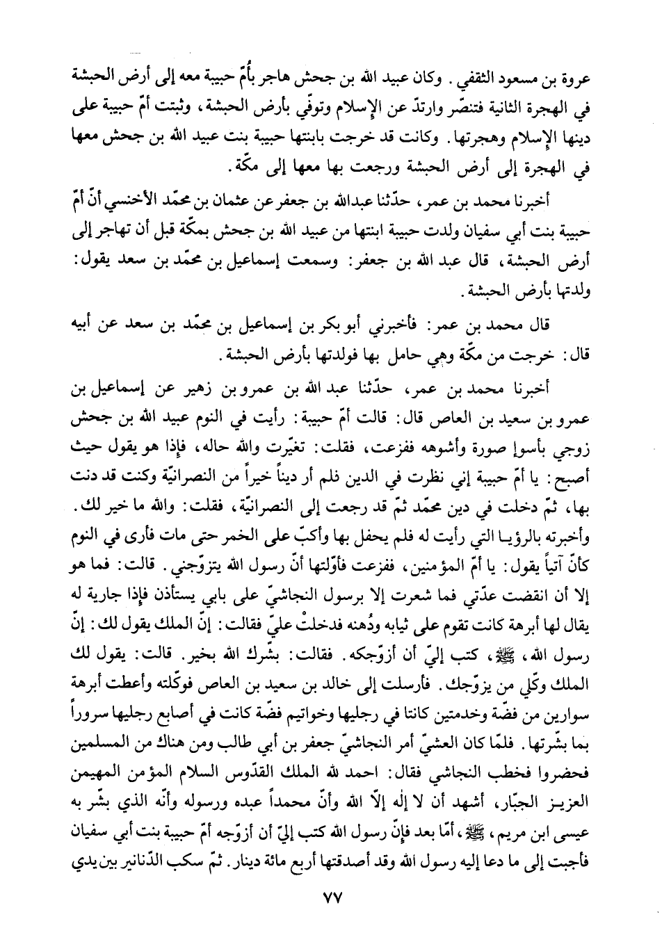 وَأَخْبَرْتُهُ بِالرُّؤْيَا الَّتِي رَأَيْتُ لَهُ فَلَمْ يَحْفَلْ بِهَا وَأَكَبَّ عَلَى الْخَمْرِ حَتَّى مَاتَ فَأَرَى فِي النَّوْمِ كَأَنَّ آتِيًا يَقُولُ: يَا أُمَّ الْمُؤْمِنِينَ. فَفَزِعْتُ فَأَوَّلْتُهَا أَنَّ رَسُولَ اللَّهِ يَتَزَوَّجُنِي. قَالَتْ: فَمَا هُوَ إِلا أَنِ انْقَضَتْ عِدَّتِي فَمَا شَعَرْتُ إِلا بِرَسُولِ النَّجَاشِيِّ عَلَى بَابِي يَسْتَأْذِنُ فَإِذَا جَارِيَةٌ لَهُ يُقَالُ لَهَا أَبْرَهَةُ كَانَتْ تَقُومُ عَلَى ثِيَابِهِ وَدَهْنِهِ فَدَخَلَتْ عَلَيَّ فَقَالَتْ: إِنَّ الْمَلِكَ يَقُولُ لَكِ: إِنَّ رَسُولَ اللَّهِ - صَلَّى اللَّهُ عَلَيْهِ وَسَلَّمَ - كَتَبَ إِلَيَّ أَنْ أُزَوِّجَكَهُ. فَقَالَتْ: بَشَّرَكِ اللَّهُ بِخَيْرٍ. قَالَتْ: يَقُولُ لَكِ الْمَلِكُ وَكِّلِي مَنْ يُزَوِّجُكِ. فَأَرْسَلَتْ إِلَى خالد بن سعيد بن العاص فوكلته وعطت أَبْرَهَةَ سِوَارَيْنِ مِنْ فِضَّةٍ وَخَدَمَتَيْنِ كَانَتَا فِي رِجْلَيْهَا وَخَوَاتِيمَ فِضَّةً كَانَتْ فِي أَصَابِعِ رِجْلَيْهَا سُرُورًا بِمَا بَشَّرَتْهَا. فَلَمَّا كَانَ الْعَشِيُّ أَمَرَ النَّجَاشِيُّ جَعْفَرَ بْنَ أَبِي طَالِبٍ وَمَنْ هُنَاكَ من المسلمين فحضروا فخطب النجاشي فقال: أحمد لِلَّهِ الْمَلِكِ الْقُدُّوسِ السَّلامِ الْمُؤْمِنِ الْمُهَيْمِنِ الْعَزِيزِ الْجَبَّارِ. أَشْهَدُ أَنَّ لا إِلَهَ إِلا اللَّهُ وَأَنَّ مُحَمَّدًا عَبْدُهُ وَرَسُولُهُ وَأَنَّهُ الَّذِي بَشَّرَ بِهِ عِيسَى ابْنُ مَرْيَمَ - صَلَّى اللَّهُ عَلَيْهِ وَسَلَّمَ - أَمَّا بَعْدُ فَإِنَّ رَسُولَ اللَّهِ كَتَبَ إِلَيَّ أَنْ أُزَوِّجَهُ أُمَّ حَبِيبَةَ بِنْتَ أَبِي سُفْيَانَ فَأَجَبْتُ إِلَى مَا دَعَا إِلَيْهِ رَسُولُ اللَّهِ وَقَدْ أَصْدَقْتُهَا أَرْبَعَ مِائَةِ دِينَارٍ. ثُمَّ سَكَبَ الدَّنَانِيرَ بَيْنَ يَدَيِ