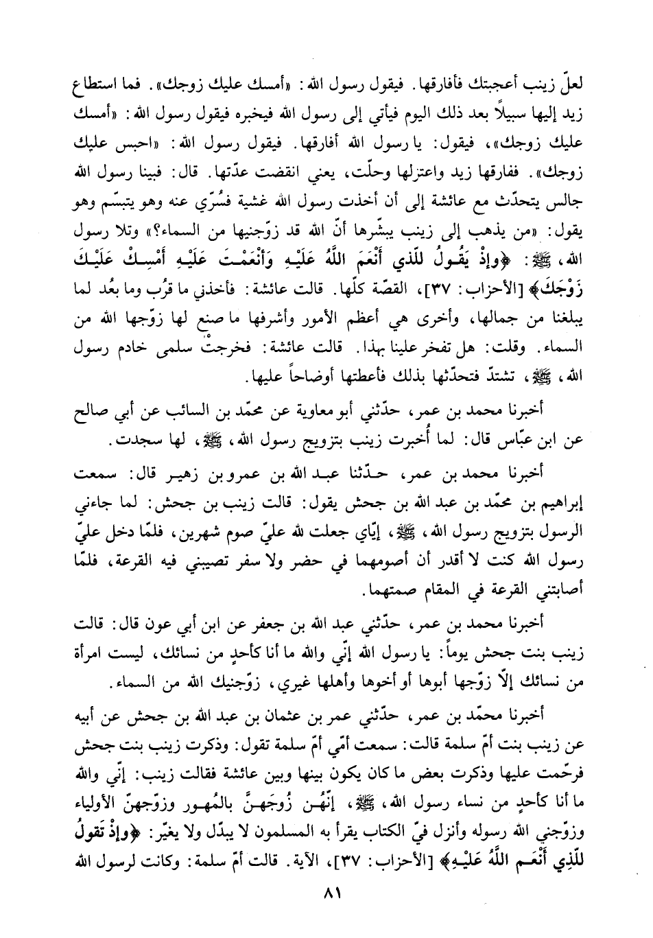 لَعَلَّ زَيْنَبَ أَعْجَبَتْكَ فَأُفَارِقُهَا. فَيَقُولُ رَسُولُ اللَّهِ: أَمْسِكْ عَلَيْكَ زَوْجَكَ. فَمَا اسْتَطَاعَ زَيْدٌ إِلَيْهَا سَبِيلا بَعْدَ ذَلِكَ الْيَوْمِ فَيَأْتِي إِلَى رَسُولِ اللَّهِ فَيُخْبِرُهُ فَيَقُولُ رَسُولُ اللَّهِ: أَمْسِكْ عَلَيْكَ زَوْجَكَ. فَيَقُولُ: يَا رَسُولَ اللَّهِ أُفَارِقُهَا. فَيَقُولُ رَسُولُ اللَّهِ: احْبِسْ عَلَيْكَ زَوْجَكَ. فَفَارَقَهَا زَيْدٌ وَاعْتَزَلَهَا وَحَلَّتْ. يَعْنِي انْقَضَتْ عِدَّتُهَا. قَالَ: فَبَيْنَا رَسُولُ اللَّهِ جَالِسٌ يَتَحَدَّثُ مَعَ عَائِشَةَ إِلَى أَنْ أَخَذَتْ رَسُولَ اللَّهِ غَشْيَةٌ فَسُرِّيَ عَنْهُ وَهُوَ يَتَبَسَّمُ وَهُوَ يَقُولُ: مَنْ يَذْهَبُ إِلَى زَيْنَبَ يُبَشِّرُهَا أَنَّ اللَّهَ قَدْ زَوَّجَنِيهَا مِنَ السماء؟] وتلا رسول الله. ص: «وَإِذْ تَقُولُ لِلَّذِي أَنْعَمَ اللَّهُ عَلَيْهِ وَأَنْعَمْتَ عَلَيْهِ أَمْسِكْ عَلَيْكَ زَوْجَكَ» الأحزاب: 37. الْقِصَّةَ كُلَّهَا. قَالَتْ عَائِشَةُ: فَأَخَذَنِي مَا قَرُبَ وَمَا بَعُدَ لِمَا يَبْلُغُنَا مِنْ جَمَالِهَا. وَأُخْرَى هِيَ أَعْظَمُ الأُمُورِ وَأَشْرَفُهَا مَا صُنِعَ لَهَا زَوَّجَهَا اللَّهُ من السماء. وقلت: هل تَفْخَرُ عَلَيْنَا بِهَذَا. قَالَتْ عَائِشَةُ: فَخَرَجَتْ سَلْمَى خادم رسول الله - صَلَّى اللَّهُ عَلَيْهِ وَسَلَّمَ - تَشْتَدُّ فَتُحَدِّثُهَا بِذَلِكَ فَأَعْطَتْهَا أَوْضَاحًا عَلَيْهَا.