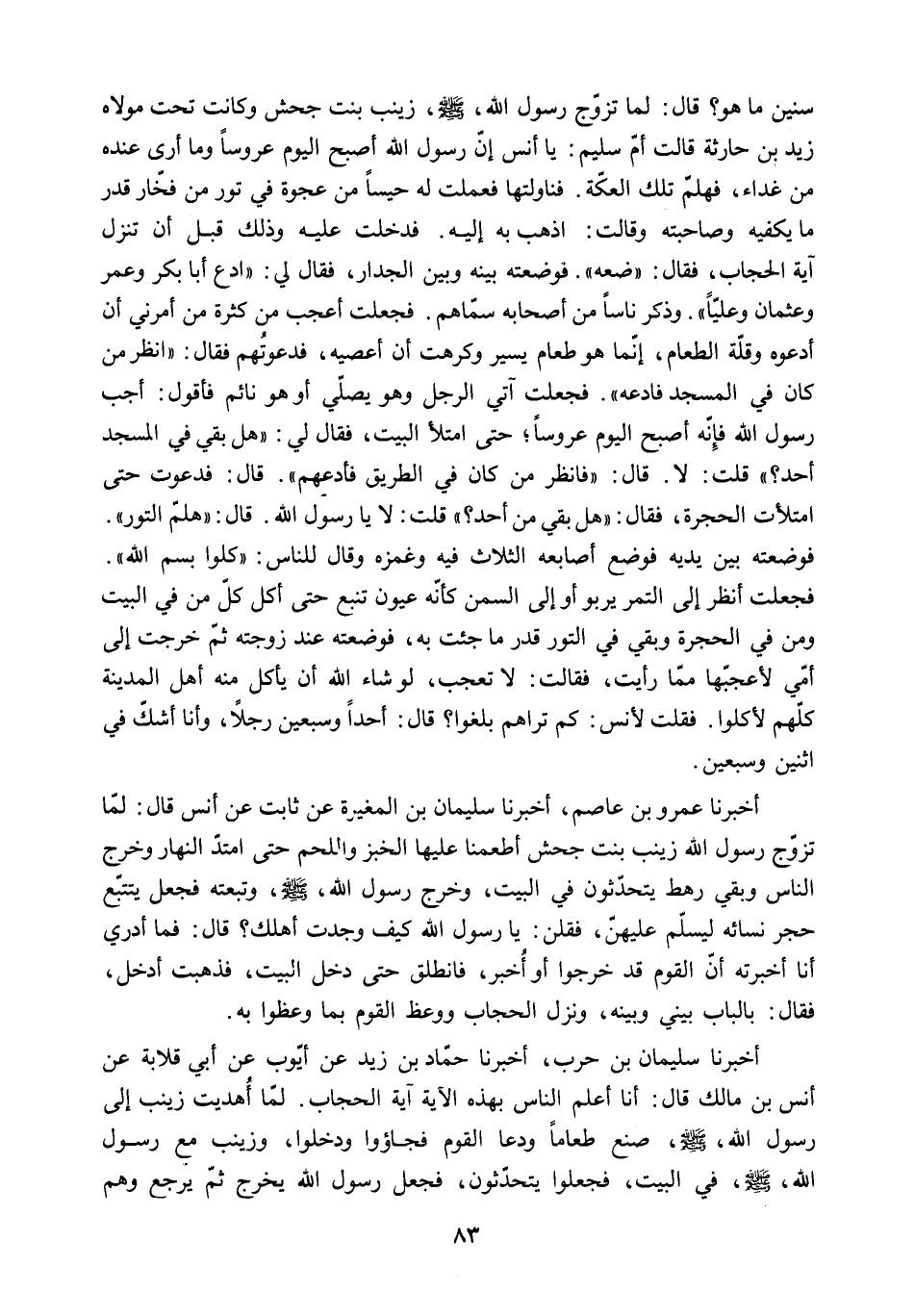 سِنِينَ مَا هُوَ؟ قَالَ: لَمَّا تَزَوَّجَ رَسُولُ اللَّهِ - صَلَّى اللَّهُ عَلَيْهِ وَسَلَّمَ - زينب بنت جَحْشٍ وَكَانَتْ تَحْتَ مَوْلاهُ زَيْدِ بْنِ حَارِثَةَ قَالَتْ أُمُّ سُلَيْمٍ: يَا أَنَسُ إِنَّ رَسُولَ اللَّهِ أَصْبَحَ الْيَوْمَ عَرُوسًا وَمَا أَرَى عِنْدَهُ مِنْ غَدَاءٍ. فَهَلُمَّ تِلْكَ الْعُكَّةَ. فَنَاوَلْتُهَا فَعَمِلْتُ لَهُ حَيْسًا مِنْ عَجْوَةٍ فِي تَوْرٍ مِنْ فَخَارٍ قَدْرَ مَا يَكْفِيهِ وَصَاحِبَتَهُ وَقَالَتْ: اذْهَبْ بِهِ إِلَيْهِ. فَدَخَلْتُ عَلَيْهِ وَذَلِكَ قَبْلَ أَنْ تَنْزِلَ آيَةُ الْحِجَابِ. فَقَالَ: ضَعْهُ. فَوَضَعْتُهُ بَيْنَهُ وَبَيْنَ الْجِدَارِ. فَقَالَ لِي: ادْعُ أَبَا بَكْرٍ وَعُمَرَ وَعُثْمَانَ وَعَلِيًّا. وَذَكَرَ نَاسًا مِنْ أَصْحَابِهِ سَمَّاهُمْ. فَجَعَلْتُ أَعْجَبُ مِنْ كَثْرَةِ مَنْ أَمَرَنِي أَنْ أَدْعُوَهُ وَقِلَّةِ الطَّعَامِ. إِنَّمَا هُوَ طَعَامٌ يَسِيرٌ وَكَرِهْتُ أَنْ أَعْصِيَهُ. فَدَعَوْتُهُمْ فَقَالَ: انْظُرْ مَنْ كَانَ فِي الْمَسْجِدِ فَادْعُهُ. فَجَعَلْتُ آتِي الرَّجُلَ وَهُوَ يُصَلِّي أَوْ هُوَ نَائِمٌ فَأَقُولُ: أَجِبْ رَسُولَ اللَّهِ فَإِنَّهُ أَصْبَحَ الْيَوْمَ عَرُوسًا. حَتَّى امْتَلأَ الْبَيْتُ. فَقَالَ لِي: هَلْ بَقِيَ فِي الْمَسْجِدِ أَحَدٌ؟ قُلْتُ: لا. قَالَ: فَانْظُرْ مَنْ كَانَ فِي الطَّرِيقِ فَادْعُهُمْ. قَالَ: فَدَعَوْتُ حَتَّى امْتَلأَتِ الْحُجْرَةُ. فَقَالَ: هَلْ بَقِيَ مِنْ أَحَدٍ؟ قُلْتُ: لا يَا رَسُولَ اللَّهِ. قَالَ: هَلُمَّ التَّوْرَ.