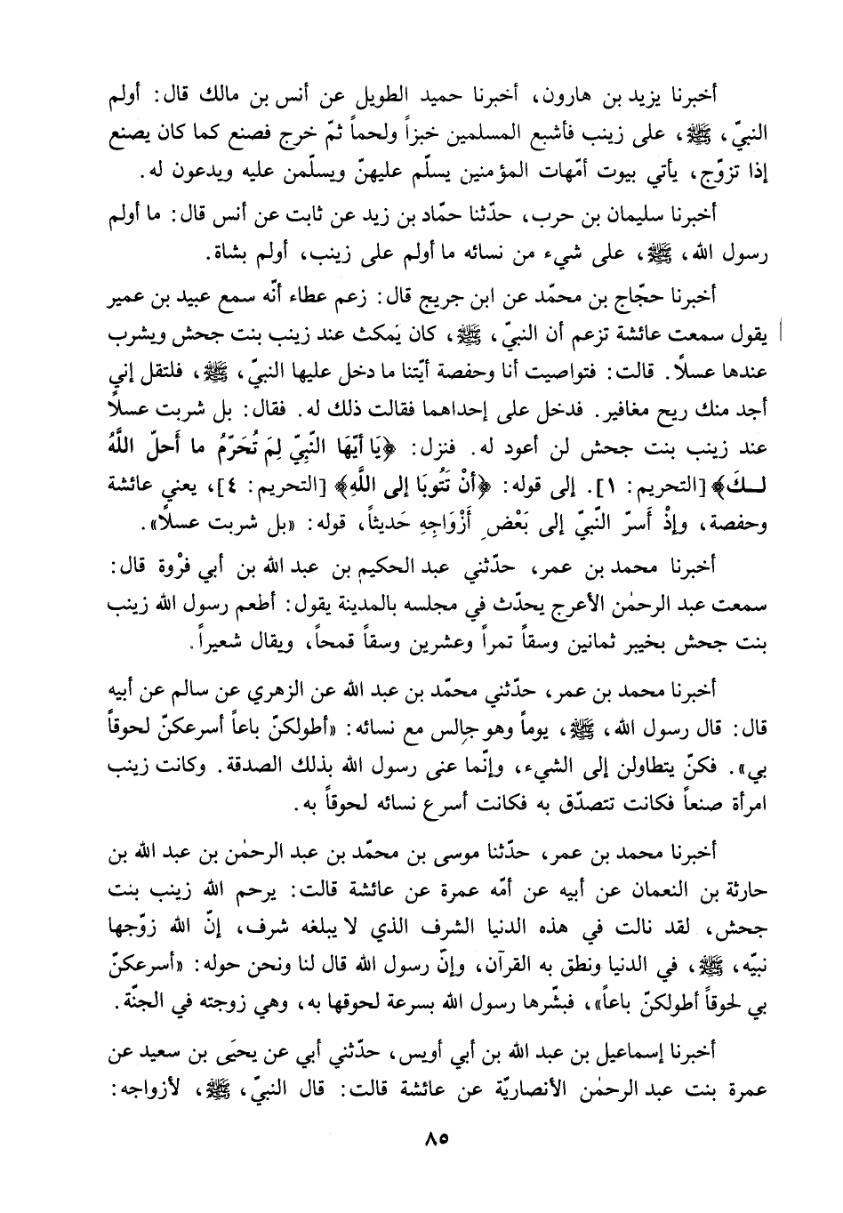 أَخْبَرَنَا يَزِيدُ بْنُ هَارُونَ. أَخْبَرَنَا حُمَيْدٌ الطَّوِيلُ عَنْ أَنَسِ بْنِ مَالِكٍ قَالَ: أَوْلَمَ النَّبِيُّ - صَلَّى اللَّهُ عَلَيْهِ وَسَلَّمَ - عَلَى زَيْنَبَ فَأَشْبَعَ الْمُسْلِمِينَ خُبْزًا وَلَحْمًا ثُمَّ خَرَجَ فَصَنَعَ كَمَا كَانَ يَصْنَعُ إِذَا تَزَوَّجَ. يَأْتِي بُيُوتَ أُمَّهَاتِ الْمُؤْمِنِينَ يُسَلِّمُ عَلَيْهِنَّ وَيُسَلِّمْنَ عَلَيْهِ وَيَدْعُونَ لَهُ.