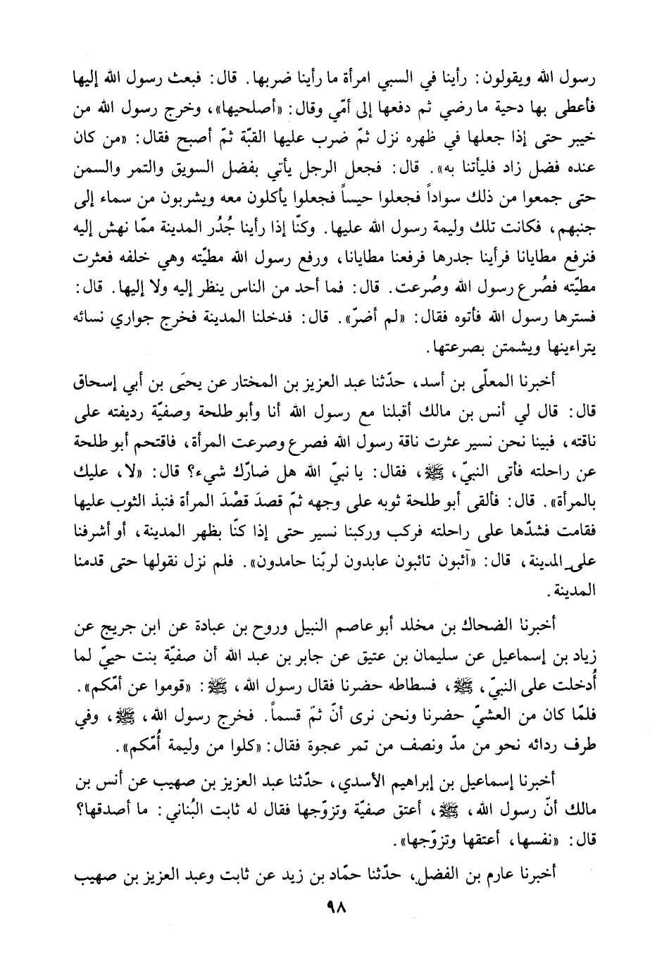 رَسُولِ اللَّهِ وَيَقُولُونَ: رَأَيْنَا فِي السَّبْيِ امْرَأَةً مَا رَأَيْنَا ضَرْبَهَا. قَالَ: فَبَعَثَ رَسُولُ اللَّهِ إِلَيْهَا فَأَعْطَى بِهَا دِحْيَةَ مَا رَضِيَ ثُمَّ دَفَعَهَا إِلَى أُمِّي وَقَالَ: أَصْلِحِيهَا. [وَخَرَجَ رَسُولُ اللَّهِ مِنْ خَيْبَرَ حَتَّى إِذَا جَعَلَهَا فِي ظَهْرِهِ نَزَلَ ثُمَّ ضَرَبَ عَلَيْهَا الْقُبَّةَ ثُمَّ أَصْبَحَ فَقَالَ: مَنْ كَانَ عِنْدَهُ فَضْلُ زَادٍ فَلْيَأْتِنَا بِهِ] . قَالَ: فَجَعَلَ الرَّجُلُ يَأْتِي بِفَضْلِ السَّوِيقِ وَالتَّمْرِ وَالسَّمْنِ حَتَّى جَمَعُوا مِنْ ذَلِكَ سَوَادًا فَجَعَلُوا حَيْسًا فَجَعَلُوا يَأْكُلُونَ مَعَهُ وَيَشْرَبُونَ من سماء إِلَى جَنْبِهِمْ. فَكَانَتْ تِلْكَ وَلِيمَةَ رَسُولِ اللَّهِ عَلَيْهَا. وَكُنَّا إِذَا رَأَيْنَا جُدُرَ الْمَدِينَةِ مِمَّا نَهَشُّ إِلَيْهِ فَنَرْفَعُ مَطَايَانَا فَرَأَيْنَا جُدُرَهَا فَرَفَعْنَا مَطَايَانَا. وَرَفَعَ رَسُولُ اللَّهِ مَطِيَّتَهُ وَهِيَ خَلْفَهُ فَعَثَرَتْ مَطِيَّتُهُ فَصُرِعَ رَسُولُ اللَّهِ وَصُرِعَتْ. قَالَ: فَمَا أَحَدٌ مِنَ النَّاسِ يَنْظُرُ إِلَيْهِ وَلا إِلَيْهَا. قَالَ: