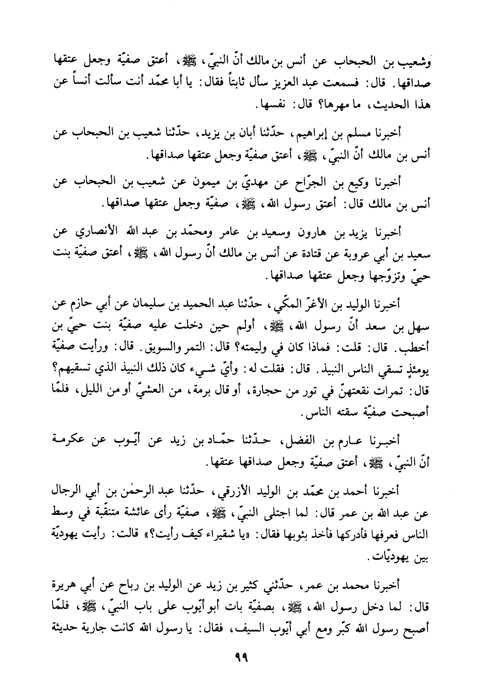 أَخْبَرَنَا مُسْلِمُ بْنُ إِبْرَاهِيمَ. حَدَّثَنَا أَبَانُ بْنُ يَزِيدَ. حَدَّثَنَا شُعَيْبُ بْنُ الْحَبْحَابِ عَنْ أَنَسِ بْنِ مَالِكٍ أَنَّ النَّبِيَّ - صَلَّى اللَّهُ عَلَيْهِ وَسَلَّمَ - أَعْتَقَ صَفِيَّةَ وَجَعَلَ عِتْقَهَا صَدَاقَهَا.