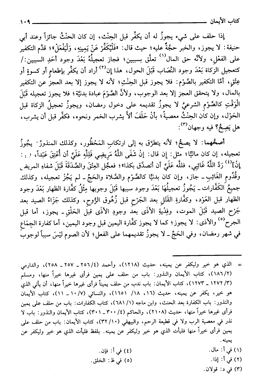 إذا حلف على شيء يجوز له أن يكفر قبل الحنث، إن كان الحنث جائزاً وعند أبي حنيفة: لا يجوز، والخبر حجة عليه؛ حيث قال: "فليكفر عن يمينه، وليفعل"؛ قدم التكفير على الفعل، ولأنه حق المال تعلق بسببين؛ فجاز تعجيله بعد وجود أحد السببين:/ كتعجيل الزكاة بعد وجود النصاب قبل الحول، هذا إن أراد أن يكفر بإطعام أو كسوة أو عتق، أما التكفير بالصوم: فلا يجوز قبل الحنث؛ لأنه لا يجوز إلا بعد العجز عن التكفير بالمال، ولا يتحقق العجز إلا بعد الوجوب، ولأن الصوم عبادة بدنية؛ فلا يجوز تعجيله قبل الوقت كالصوم الشرعي لا يجوز تقديمه على دخول رمضان، ويجوز تعجيل الزكاة قبل الحول، وإن كان الحنث معصية؛ بأن حلف ألا يشرب الخمر ونحوه، فكفر قبل أن يشرب، هل يصح؟ فيه وجهان: