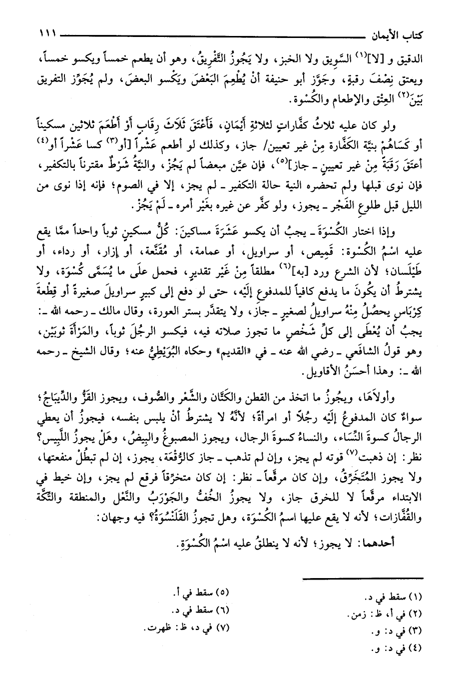 وإذا اختار الكسوة- يجب أن يكسو عشرة مساكين: كل مسكين ثوباً واحداً مما يقع عليه اسم الكسوة: قميص، أو سراويل، أو عمامة، أو مقنعة، أو إزار، أو رداء، أو طيلسان؛ لأن الشرع ورد [به] مطلقاً من غير تقدير، فحمل على ما يسمى كسوة، ولا يشترط أن يكون ما يدفع كافياً للمدفوع إليه، حتى لو دفع إلى كبير سراويل صغيرة أو قطعة كرباس يحصل منه سراويل لصغير- جاز، ولا يتقدر بستر العورة، وقال مالك- رحمه الله-: يجب أن يعطى إلى كل شخص ما تجوز صلاته فيه، فيكسو الرجل ثوباً، والمرأة ثوبين، وهو قول الشافعي- رضي الله عنه- في "القديم" وحكاه البويطي عنه؛ وقال الشيخ- رحمه الله-: وهذا أحسن الأقاويل.