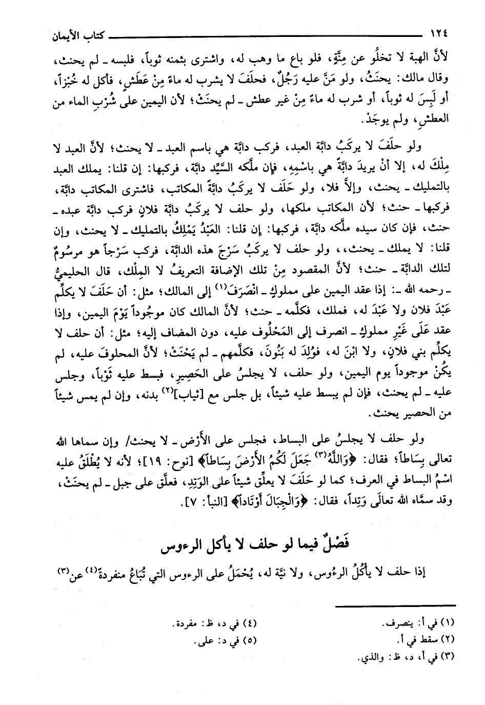 ولو حلف لا يركب دابة العبد، فركب دابة هي باسم العبد- لا يحنث؛ لأن العبد لا ملك له، إلا أنيريد دابة هي باسمه، فإن ملكه السيد دابة، فركبها: إن قلنا: يملك العبد بالتمليك- يحنث، وإلا فلا، ولو حلف لا يركب دابة المكاتب، فاشترى المكاتب دابة، فركبها- حنث؛ لأن المكاتب ملكها، ولو حلف لا يركب دابة فلان فركب دابة عبده- حنث، فإن كان سيده ملكه دابة، فركبها: إن قلنا: العبد يملك بالتمليك- لا يحنث، وإن قلنا: لا يملك- يحنث، ولو حلف لا يركب سرج هذه الدابة، فركب سرجاً هو مرسوم لتلك الدابة- حنث؛ لأن المقصود من تلك الإضافة التعريف لا الملك، قال الحليمي - رحمه الله-: إذا عقد اليمين على مملوك- انصرف إلى المالك؛ مثل: أن حلف لا يكلم عبد فلان ولا عبد له، فملك، كلمه- حنث؛ لأن المالك كان موجوداً يوم اليمين، وإذا عقد على غير مملوك- انصرف إلى المحلوف عليه، دون المضاف إليه؛ مثل: أن حلف لا يكلم بني فلان، ولا ابن له، فولد له بنون، فكلمهم- لم يحنث؛ لأن المحلوف عليه، لم يكن موجوداً يوم اليمين، ولو حلف، لا يجلس على الحصير، فبسط عليه ثوباً، وجلس عليه- لم يحنث، فإن لم يبسط عليه شيئاً، بل جلس مع [ثياب] بدنه، وإن لم يمس شيئاً من الحصير يحنث.