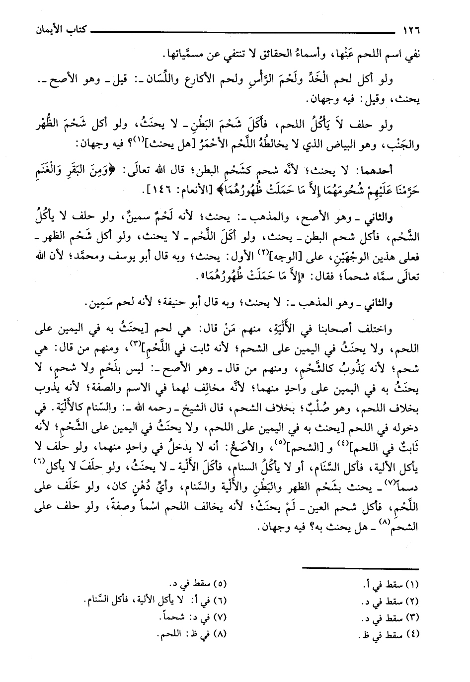 والثاني- وهو الأصح، والمذهب-: يحنث؛ لأنه لحم سمين، ولو حلف لا يأكل الشحم، فأكل شحم البطن- يحنث، ولو أكل اللحم- لا يحنث، ولو أكل شحم الظهر- فعلى هذين الوجهين، على [الوجه] الأول: يحنث؛ وبه قال أبو يوسف ومحمد؛ لأن الله تعالى سماه شحماً؛ فقال: "إلا ما حملت ظهورهما".