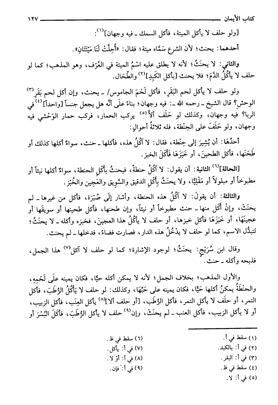 ولو حلف لا يأكل لحم البقر، فأكل لحم الجاموس/ - يحنث، وإن أكل لحم بقر الوحش؟ قال الشيخ- رحمه الله-: فيه وجهان؛ بناءً على أنه هل يجعل جنساً [واحداً] في الربا؟ فيه وجهان، وكذلك لو حلف ألا يركب الحمار، فركب حمار الوحشي فيه وجان، ولو حلف على الحنطة، فله ثلاثة أحوال: