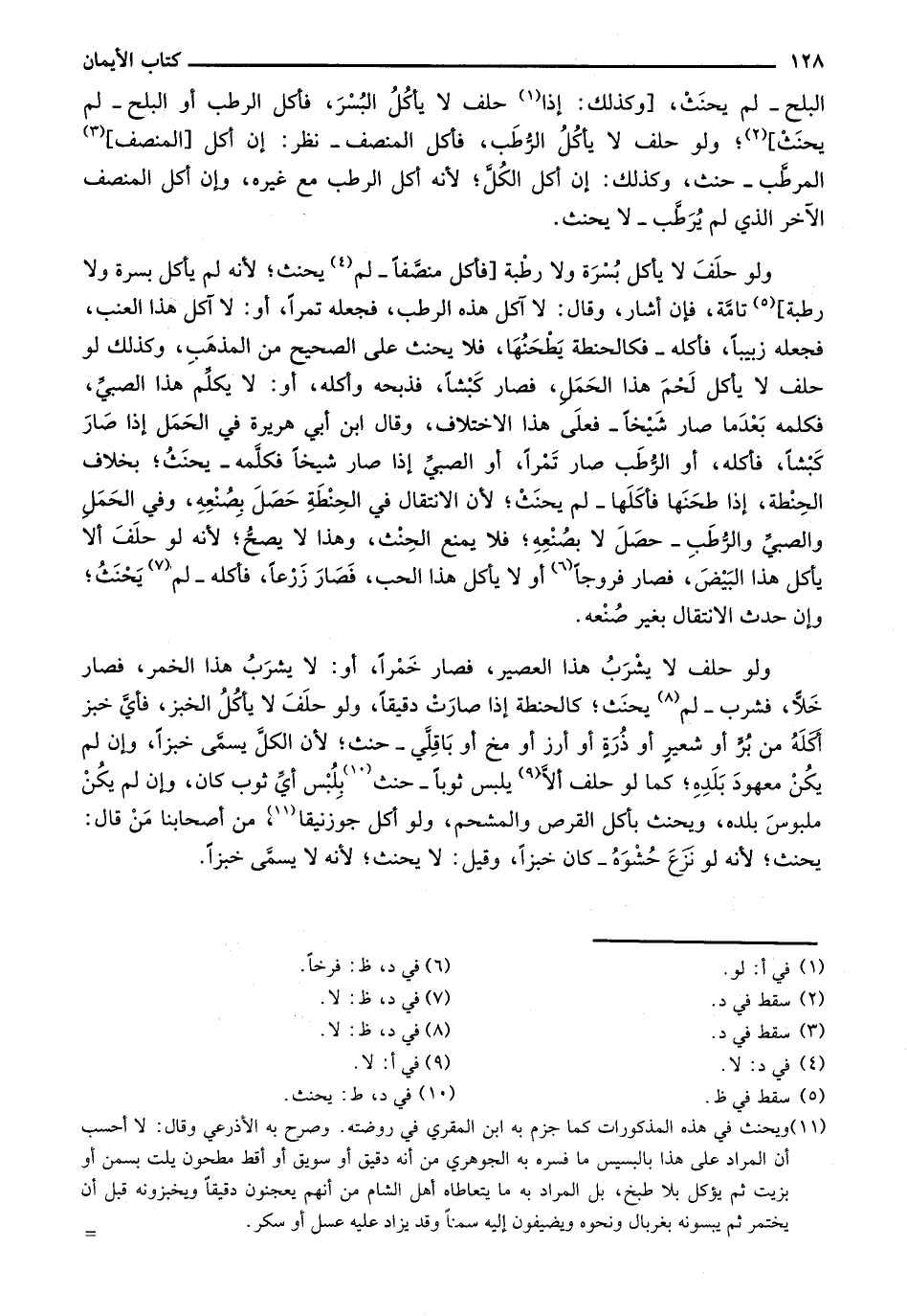 ولو حلف لا يأكل بسرة ولا رطبة [فأكل منصفاً- لم يحنث؛ لأنه لم يأكل بسرة ولا رطبة] تامة، فإن أشار، وقال: لا آكل هذه الرطب، فجعله تمراً، أو: لا آكل هذا العنب، فجعله زبيباً، فأكله- فكالحنطة يطحنها، فلا يحنث على الصحيح من المذهب، وكذلك لو حلف لا يأكل لحم هذا الحمل، فصار كبشاً، فذبحه وأكله، أو: لا يكلم هذا الصبي، فكلمه بعدما صار شيخاً- فعلى هذا الاختلاف، وقال ابن أبي هريرة في الحمل إذا صار كبشاً، فأكله، أو الرطب صار تمراً، أو الصبي إذا صار شيخاً فكلمه- يحنث؛ بخلاف الحنطة، إذا طحنها فأكلها- لم يحنث؛ لأن الانتقال في الحنطة حصل بصنعه، وفي الحمل ولاصبي والرطب- حصل لا بصنعه؛ فلا يمنع الحنث، وهذا لا يصح؛ لأنه لو حلف ألا يأكل هذا البيض، فصار فروجاً أو لا يأكل هذا الحب، فصار زرعاً، فأكله- لم يحنث؛ وإن حدث الانتقال بغير صنعه.