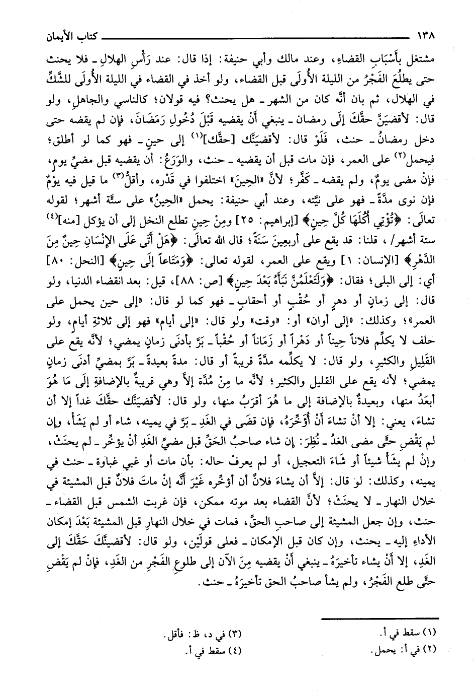 مشتغل بأسباب القضاء، وعند مالك وأبي حنيفة: إذا قال: عند رأس الهلال- فلا يحنث حتى يطلع الفجر من الليلة الأولى قبل القضاء، ولو أخذ في القضاء في الليلة الأولى للشك في الهلال، ثم بان أنه كان من الشهر- هل يحنث؟ فيه قولان؛ كالناسي والجاهل، ولو قال: لأقضين حقك إلى رمضان- ينبغي أن يقضيه قبل دخول رمضان، فإن لم يقضه حتى دخل رمضان- حنث، فلو قال: لأقضينك [حقك] إلى حين- فهو كما لو أطلق؛ فيحمل على العمر، فإن مات قبل أن يقضيه- حنث، والورع: أن يقضيه قبل مضي يوم، فإن مضى يوم، ولم يقضه- كفر؛ لأن "الحين" اختلفوا في قدره، وأقل ما قيل فيه يوم فإن نوى مدة- فهو على نيته، وعند أبي حنيفة: يحمل "الحين" على ستة أشهر؛ لقوله تعالى: {تُؤْتِي أُكُلَهَا كُلَّ حِينٍ} [إبراهيم: 25] ومن حين تطلع النخل إلى أن يؤكل [منه] ستة أشهر، قلنا: قد يقع على أربعين سنة؛ قال الله تعالى: {هَلْ أَتَى عَلَى الإِنسَانِ حِينٌ مِنَ الدَّهْرِ} [الإنسان: 1] ويقع على العمر، لقوله تعالى: {وَمَتَاعاً إِلَى حِينٍ} [النحل: 8.] أي: إلى البلى؛ فقال: {وَلَتَعْلَمُنَّ نَبَأَهُ بَعْدَ حِينٍ} [ص: 88]، قيل: بعد انقضاء الدنيا، ولو قال: إلى زمان أو دهر أو حقب أو أحقاب- فهو كما لو قال: "إلى حين يحمل على العمر"؛ وكذلك: "إلى أوان" أو: "وقت" ولو قال: "إلى أيام" فهو إلى ثلاثة أيام، ولو حلف لا يكلم فلاناً حيناً أو دهراً أو زماناً أو حقباً- بر بأدنى زمان يمضي" لأنه يقع على القليل والكثير، ولو قال: لا يكلمه مدة قريبة أو قال: مدة بعيدة- بر بمضي أدنى زمان يمضي؛ لأنه يقع على القليل والكثير؛ لأنه ما من مدة إلا وهي قريبة بالإضافة إلى ما هو أبعد منها، وبعيدة بالإضافة إلى ما هو أقرب منها، ولو قال: لأقضينك حقك غداً إلا أن تشاء، يعني: إلا أن تشاء أن أؤخره، فإن قضى في الغد- بر في يمينه، شاء أو لم يشأ، وإن لم يقض حتى مضى الغد- نظر: إن شاء صاحب الحق قبل مضي الغد أن يؤخر- لم يحنث، وإن لم يشأ شيئاً أو شاء التعجيل، أو لم يعرف حاله: بأن مات أو غبي غباوة- حنث في يمينه، وكذلك: لو قال: إلا أن يشاء فلان أن أؤخره غير أنه إن مات فلان قبل المشيئة في خلال النهار- لا يحنث؛ لأن القضاء بعد موته ممكن، فإن غربت الشمس قبل القضاء- حنث، وإن جعل المشيئة إلى صاحب الحق، فمات في خلال النهار قبل المشيئة بعد إمكان الأداء إليه- يحنث، وإن كان قبل الإمكان- فعلى قولين، ولو قال: لأقضينك حقك إلى الغد، إلا أن يشاء تأخيره- ينبغي أن يقضيه من الآن إلى طلوع الفجر من الغد، فإن لم يقض حتى طلع الفجر، ولم يشأ صاحب الحق تأخيره- حنث.