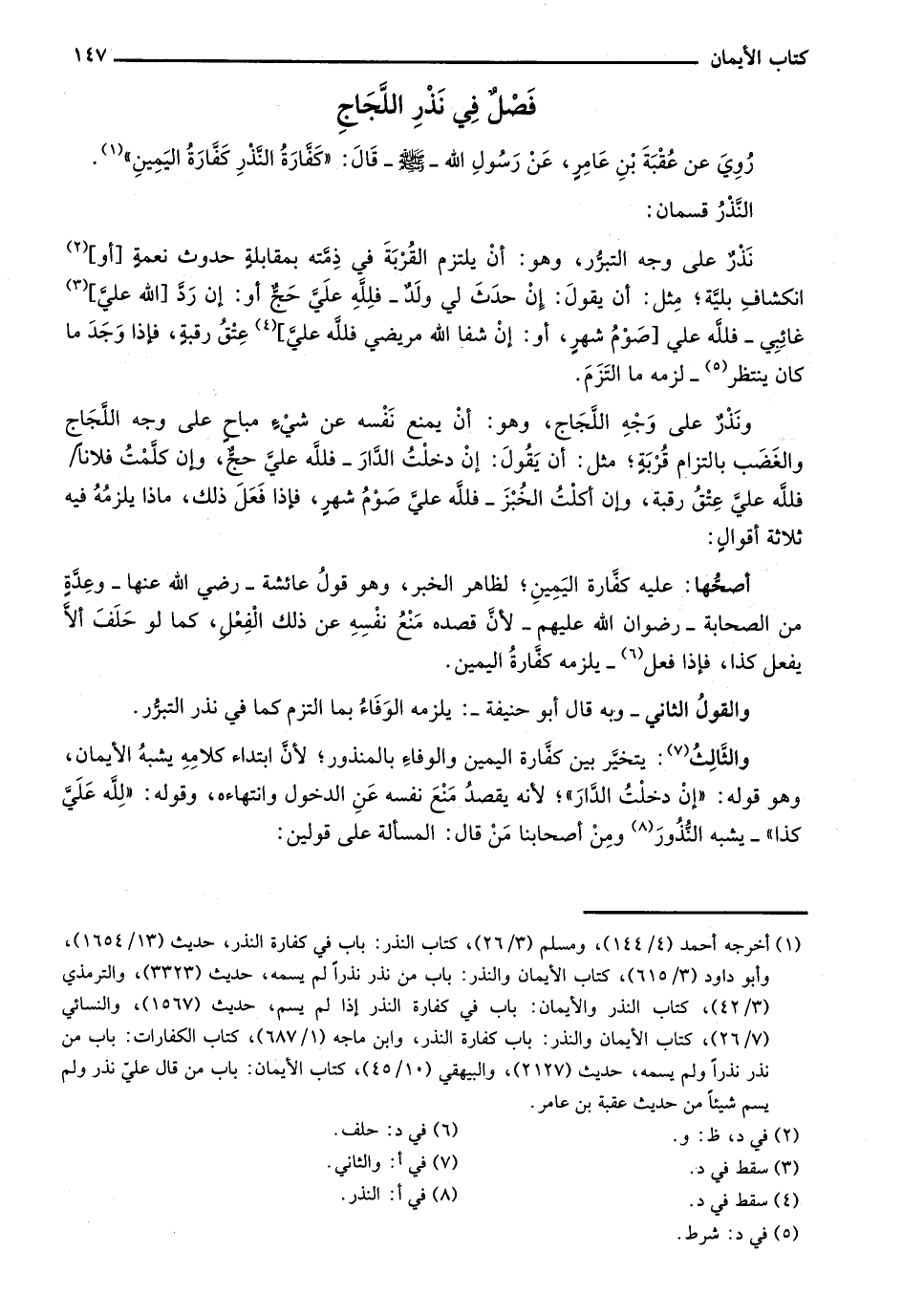 ونذر على وجه اللجاج، وهو: أن يمنع نفسه عن شيء مباح على وجه اللجاج والغضب بالتزام قربة؛ مثل: أن يقول: إن دخلت الدار- فلله علي حج، وإن كلمت فلاناً/ فلله علي عتق رقبة، وإن أكلت الخبز- فلله علي صوم شهر، فإذا فعل ذلك، ماذا يلزمه فيه ثلاثة أقوال: