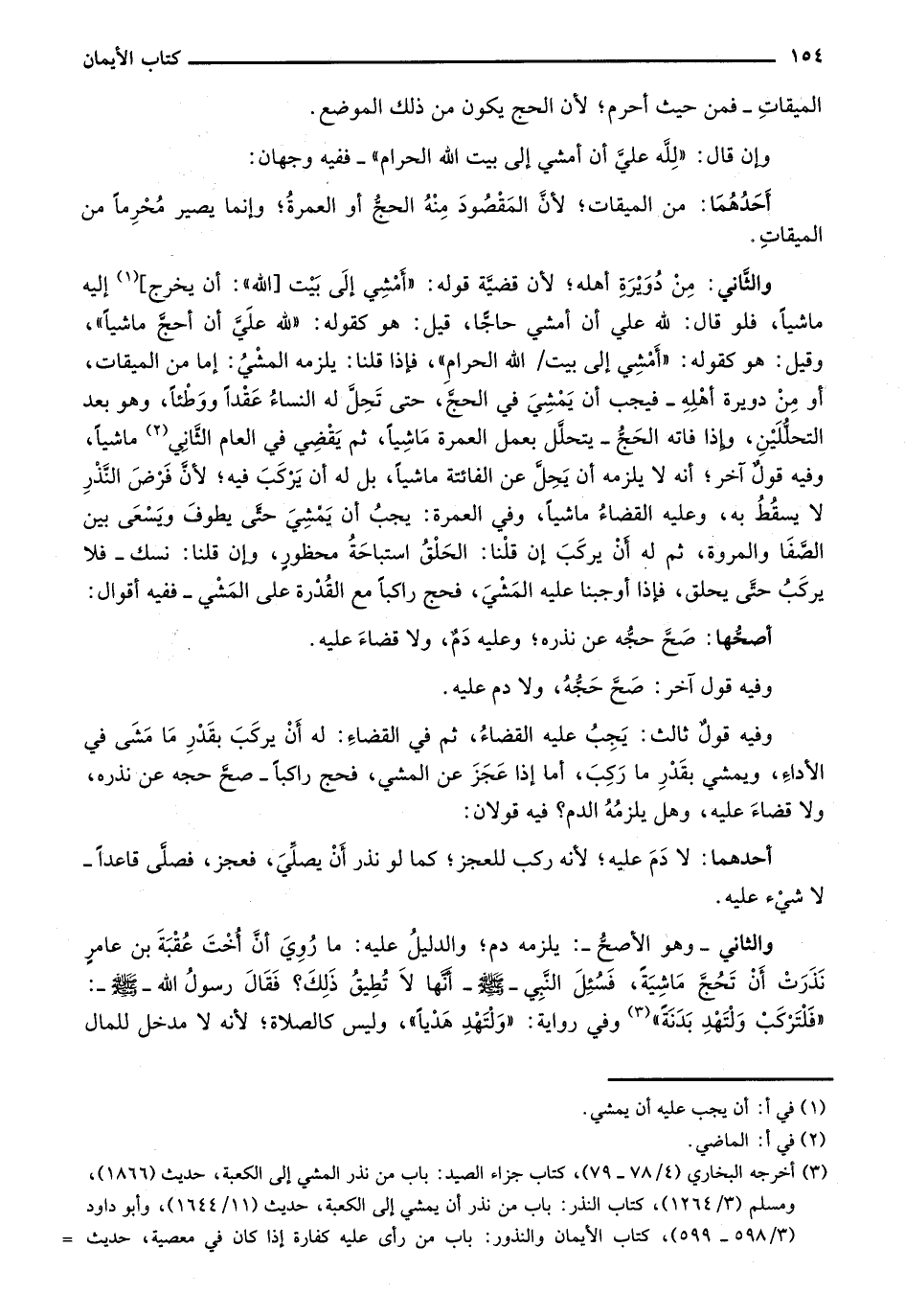 والثاني: من دويرة أهله؛ لأن قضية قوله: "أمشي إلى بيت [الله": أن يخرج] إليه ماشياً، فلو قال: لله علي أن أمشي حاجاً، قيل: هو كقوله: "لله علي أن أحج ماشياً"، وقيل: هو كقوله: "أمشي إلى بيت/ الله الحرام"، فإذا قلنا: يلزمه المشي: إما من الميقات، أو من دويرة أهله- فيجب أن يمشي في الحج، حتى تحل له النساء عقداً ووطئاً، وهو بعد التحللين، وإذا فاته الحج- يتحلل بعمل العمرة ماشياً، ثم يقضي في العام الثاني ماشياً، وفيه قول آخر؛ أنه لا يلزمه أن يحل عن الفائتة ماشياً، بل له أن يركب فيه؛ لأن فرض النذر لا يسقط به، وعليه القضاء ماشياً، وفي العمرة: يجب أن يمشي حتى يطوف ويسعى بين الصفا والمروة، ثم له أن يركب إن قلنا: الحلق استباحة محظور، وإن قلنا: نسك- فلا يركب حتى يحلق، فإذا أوجبنا عليه المشي، فحج راكباً مع القدرة على المشي- ففيه أقوال: