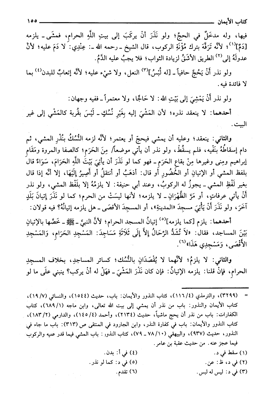 والثاني: ينعقد؛ وعليه أن يمشي فيحج أو يعتمر؛ لأنه لزمه النسك بنذر المشي، ثم دام إسقاطه بنفيه، فلم يسقط، ولو نذر أن يأتي موضعاً/ من الحرم/ كالصفا والمروة ومقام إبراهيم ومنى وغيرها من بقاع الحرم- فهو كما لو نذر أن يأتي بيت الله الحرام، سواء قال بلفظ المشي أو الإتيان أو الحضور أو قال: أذهب أو أنتقل أو أصير إليها، إلا أنه إذا قال بغير لفظ المشي- يجوز له الركوب، وعند أبي حنيفة: لا يلزمه إلا بلفظ المشي، ولو نذر أن يأتي عرفات، أو مر الظهران- لا يلزمه؛ لأنها ليست من الحرم؛ كما لو نذر إتيان بلد آخر، ولو نذر أن يأتي مسجد "المدينة"، أو المسجد الأقصى- هل يلزمه إتيانه؟ فيه قولان: