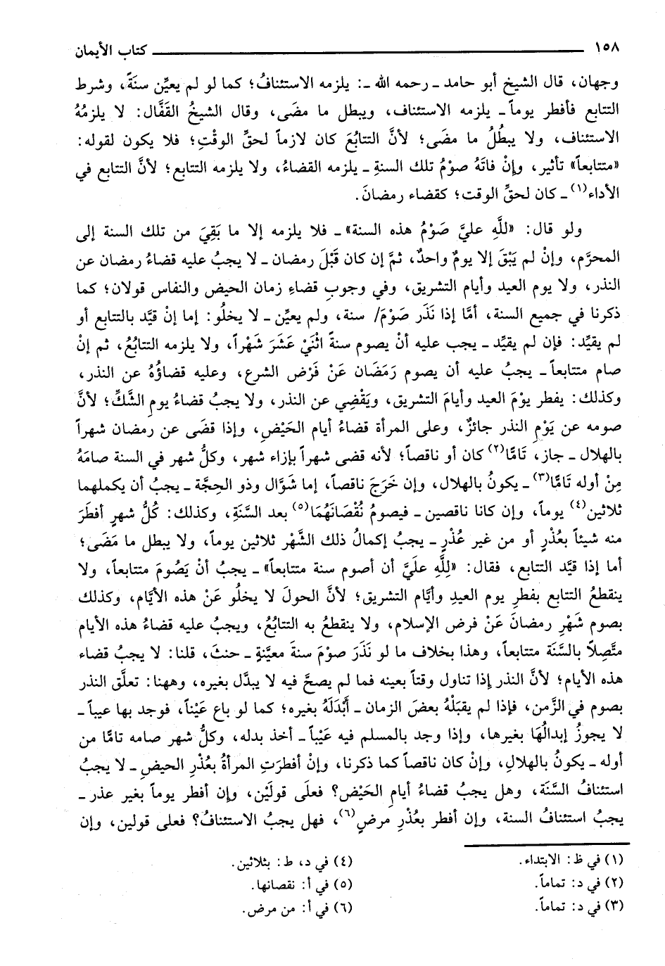 ولو قال: "لله علي صوم هذه السنة"- فلا يلزمه إلا ما بقي من تلك السنة إلى المحرم، وإن لم يبق إلا يوم واحد، ثم إن كان قبل رمضان- لا يجب عليه قضاء رمضان عن النذر، ولا يوم العيد وأيام التشريق، وفي وجوب قضاء زمان الحيض والنفاس قولان؛ كما ذكرنا في جميع السنة، أما إذا نذر صوم/ سنة، ولم يعين- لا يخلو: إما إن قيد بالتتابع أو لم يقيد: فإن لم يقيد- يجب عليه أن يصوم سنة اثني عشر شهراً، ولا يلزمه التتابع، ثم إن صام متتابعاً- يجب عليه أن يصوم رمضان عن فرض الشرع، وعليه قضاؤه عن النذر، وكذلك: يفطر يوم العيد وأيام التشريق، ويقضي عن النذر، ولا يجب قضاء يوم الشك؛ لأن صومه عن يوم النذر جائز، وعلى المرأة قضاء أيام الحيض، وإذا قضى عن رمضان شهراً بالهلال- جاز، تاماً كان أو ناقصاً؛ لنه قضى شهراً بإزاء شهر، وكل شهر في السنة صامه من أوله تاماً- يكون بالهلال، وإن خرج ناقصاً، إما شوال وذو الحجة- يجب أن يكملهما ثلاثين يوماً، وإن كانا ناقصين- فيصوم نقصانهما بعد السنة، وكذلك: كل شهر أفطر منه شيئاً بعذر أو من غير عذر- يجب إكمال ذلك الشهر ثلاثين يوماً، ولا يبطل ما مضى؛ أما إذا قيد التتابع، فقال: "لله علي أن أصوم سنة متتابعاً"- يجب أن يصوم متتابعاً، ولا ينقطع التتابع بفطر يوم العيد وأيام التشريق؛ لن الحول لا يخلو عن هذه الأيام، وكذلك بصوم شهر رمضان عن فرض الإسلام، ولا ينقطع به التتابع، ويجب عليه قضاء هذه الأيام متصلاً بالسنة متتابعاً، وهذا بخلاف ما لو نذر صوم سنة معينة- حنث، قلنا: لا يجب قضاء هذه الأيام؛ لأن النذر إذا تناول وقتاً بعينه فما لم يصح فيه لا يبدل بغيره، وههنا: تعلق النذر بصوم في الزمن، فإذا لم يقبله بعض الزمان- أبدله بغيره؛ كما لو باع عيناً، فوجد بها عيباً لا يجوز إبدالها بغيرها، وإذا وجد بالمسلم فيه عيباً- أخذ بدله، وكل شهر صامه تاماً من أوله- يكون بالهلال، وإن كان ناقصاً كما ذكرنا، وإن أفطرت المرأة بعذر الحيض- لا يجب استئناف السنة، وهل يجب قضاء أيام الحيض؟ فعلى قولين، وإن أفطر يوما بغير عذر- يجب استئناف السنة، وإن أفطر بعذر مرض، فهل يجب الاستئناف؟ فعلى قولين، وإن