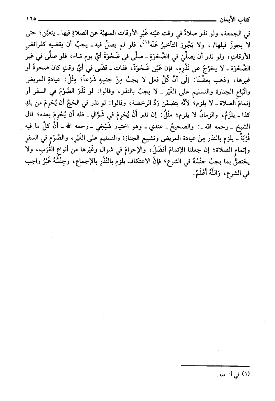 في الجمعة، ولون ذر صلاة في وقت عينه غير الأوقات المنهية عن الصلاة فيها- يتعين؛ حتى لا يجوز قبلها/، ولا يجوز التأخير عنه، فلو لم يصل فيه- يجب أن يقضيه كفرائض الأوقات، ولو نذر أن يصلي في الضحوة- صلى في ضحوة أي يوم شاء، فلو صلى في غير الضحوة- لا يخرج عن نذره، فإن عين ضحوة، ففات- قضى في أي وقت كان ضحوة أو غيرها، وذهب بعضنا: إلى أن كل فعل لا يجب من جنسه شرعاً؛ مثل: عيادة المريض واتباع الجنازة والتسليم على الغير- لا يجب بالنذر، وقالوا: لو نذر الصوم في السفر أو إتمام الصلاة- لا يلزم؛ لأنه يتضمن رد الرخصة، وقالوا: لو نذر في الحج أن يحرم من بلد كذا- يلزم، والزمان لا يلزم؛ مثل: إن نذر أن يحرم في شوال- فله أن يحرم بعده؛ قال الشيخ- رحمه الله-: والصحيح- عندي- وهو اختيار شيخي- رحمه الله- أن كل ما فيه قربة- يلزم بالنذر من عيادة المريض وتشييع الجنازة والتسليم على الغير، والصوم في السفر وإتمام الصلاة؛ إن جعلنا الإتمام أفضل، والإحرام في شوال وغيرها من أنواع القرب، ولا يختص بما يجب جنسه في الشرع؛ فإن الاعتكاف يلزم بالنذر بالإجماع، وجنسه غير واجب في الشرع، والله أعلم.